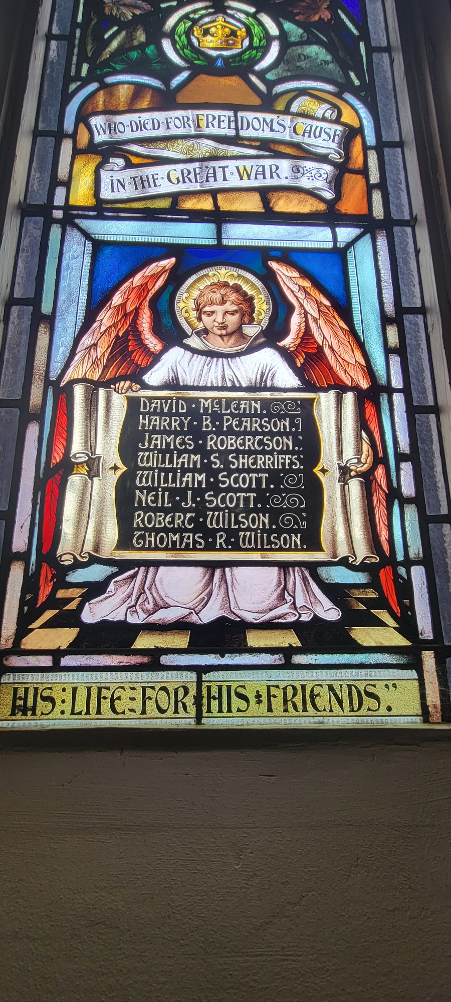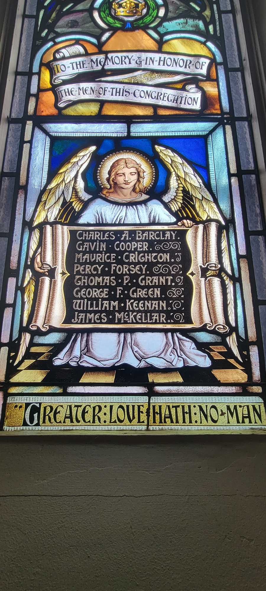 Le 12 octobre 1919, un vitrail a été dévoilé en l’honneur des paroissiens de l’église presbytérienne de North Broadview qui ont donné leur vie au cours de la Première Guerre mondiale. La fenêtre a été conçue et construite par C.D. Warner, un membre de la congrégation. Elle se compose de trois panneaux : le panneau central représente le Bon Pasteur avec un bâton, tenant un agneau dans ses bras, et les autres panneaux sont ornés de lauriers et d’une couronne énumérant les noms des 16 personnes tuées pendant leur service actif.