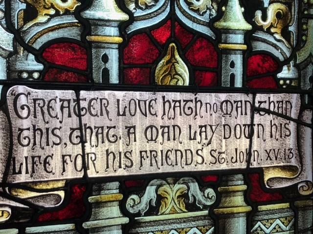 Le vitrail est une belle œuvre d’art religieux. La partie centrale représente la crucifixion, avec la Ville sainte en arrière-plan. De chaque côté se trouvent les figures de Marie et de Saint-Jean, tandis qu’en dessous figure une scène de bataille, où une infirmière de la Croix-Rouge s’occupe d’un soldat blessé au premier plan.