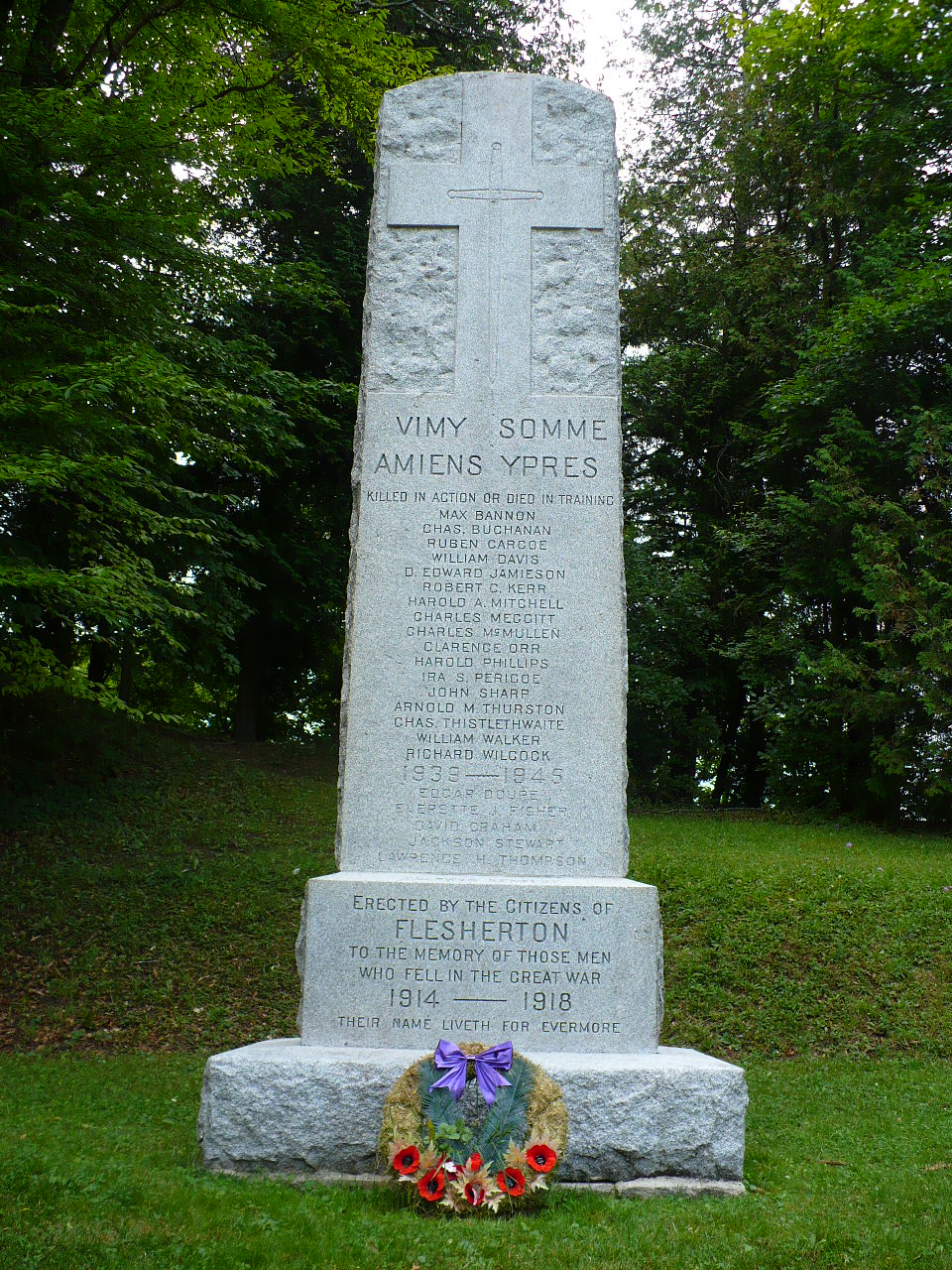 Ce cénotaphe a été dévoilé le 3 août 1938 au Memorial Park par Mme Mary Jamieson. Sa fille et ses trois fils ont servi le Canada; l’un de ceux-ci fut tué au combat et les deux autres sont aujourd’hui décédés. Sa fille, May Jamieson, était la seule infirmière de toute la communauté de Flesherton pendant la guerre et une place d’honneur lui fut attribuée lors du dévoilement du cénotaphe. Lorsque Mme Mary Jamieson procède à la coupe du ruban qui tenait le drapeau sous lequel se trouvait le mémorial, elle utilise la même paire de ciseaux à bandage qui servait à sa file lors de son travail à l’hôpital à Malte.