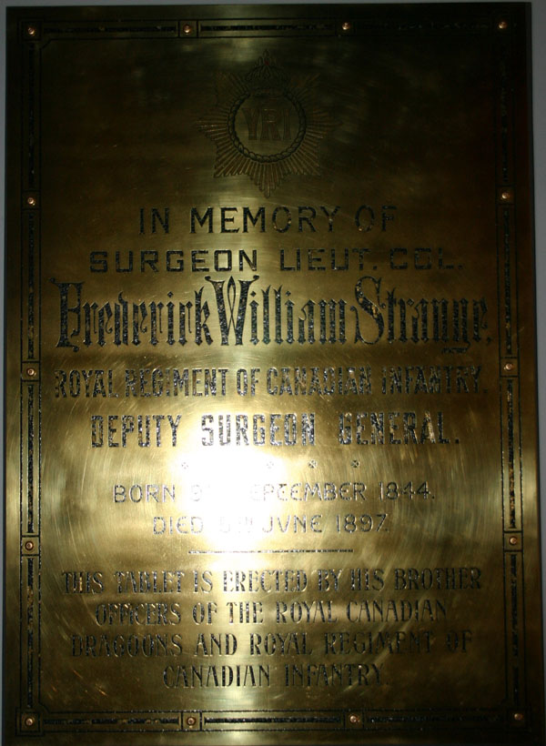 Ce mémorial est dédié à Frederick William Strange. Il a été érigé par son frère, ainsi que par les officiers du Royal Canadian Dragoons et du Royal Regiment of Canadian Infantry.