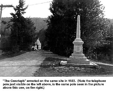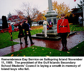 Le premier mémorial militaire érigé à cet endroit était une structure de bois portant les noms des combattants et des morts sur de grands panneaux blancs placés deux par deux sur chacun des quatre côtés du mémorial. Les noms de tous les hommes et de toutes les femmes au service de leur pays étaient inscrits sur ce « sanctuaire », et y étaient ajoutés au fur et à mesure des nouvelles arrivées. Ceux des morts étaient marqués d’une croix. (Un ouvrage de maçonnerie permanent a été déménagé au centre du parc commémoratif, alors en cours d’aménagement.) Au début de la Première Guerre mondiale, l’île Saltspring comptait environ 1 000 habitants. De ce nombre, 150 hommes et femmes se sont enrôlés dans les forces armées; neuf ont perdu la vie - deux dans la MRC, trois dans l’Armée et quatre dans l’ARC ou la RAF. Il y a 79 ans depuis 1996, le premier service du jour du Souvenir avait lieu à l’île Saltspring. Depuis 1931, ces cérémonies sont organisées et dirigées par la filiale no 92 de la Légion royale canadienne. D’autres cérémonies ont également eu lieu au cénotaphe, notamment pour commémorer le débarquement et la victoire en Europe. (C’est également là qu’a lieu la cérémonie annuelle du lever du drapeau du Canada.)