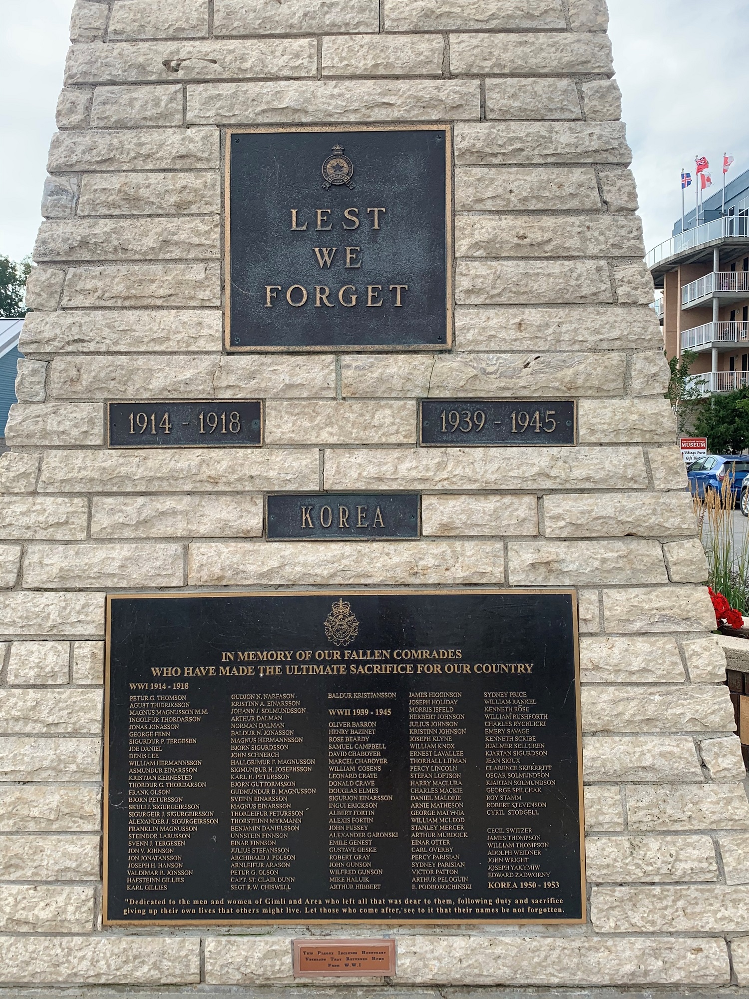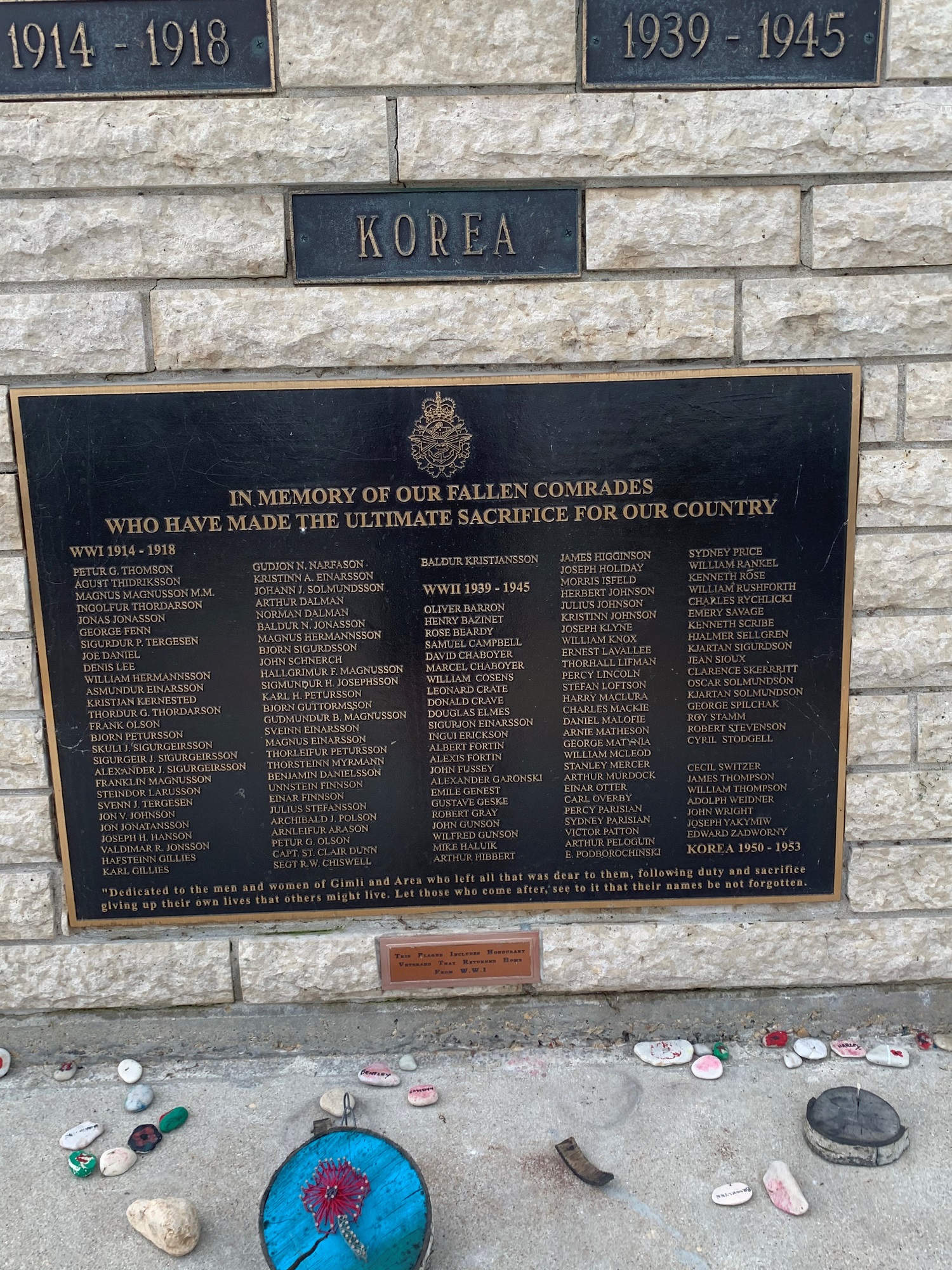 Ce mémorial a été érigé comme projet du Centenaire en 1967, par la Légion de Gimli. Il est dédié à ceux et celles qui ont péri durant les Première et Seconde Guerres mondiales et la guerre de Corée. La conception et la réalisation sont de Leonard Ciszewski, artiste local. Le dévoilement du tumulus a eu lieu lors de la cérémonie du Jour du Souvenir cette même année.