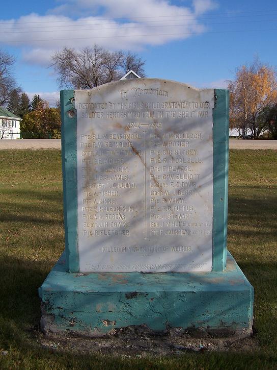 La cloche commémorative et la plaque de la Première Guerre mondiale ont été installées par les Guides de Grandview afin d’honorer la mémoire de tous les hommes de la ville et du district qui sont morts en service au cours de la Première Guerre mondiale.