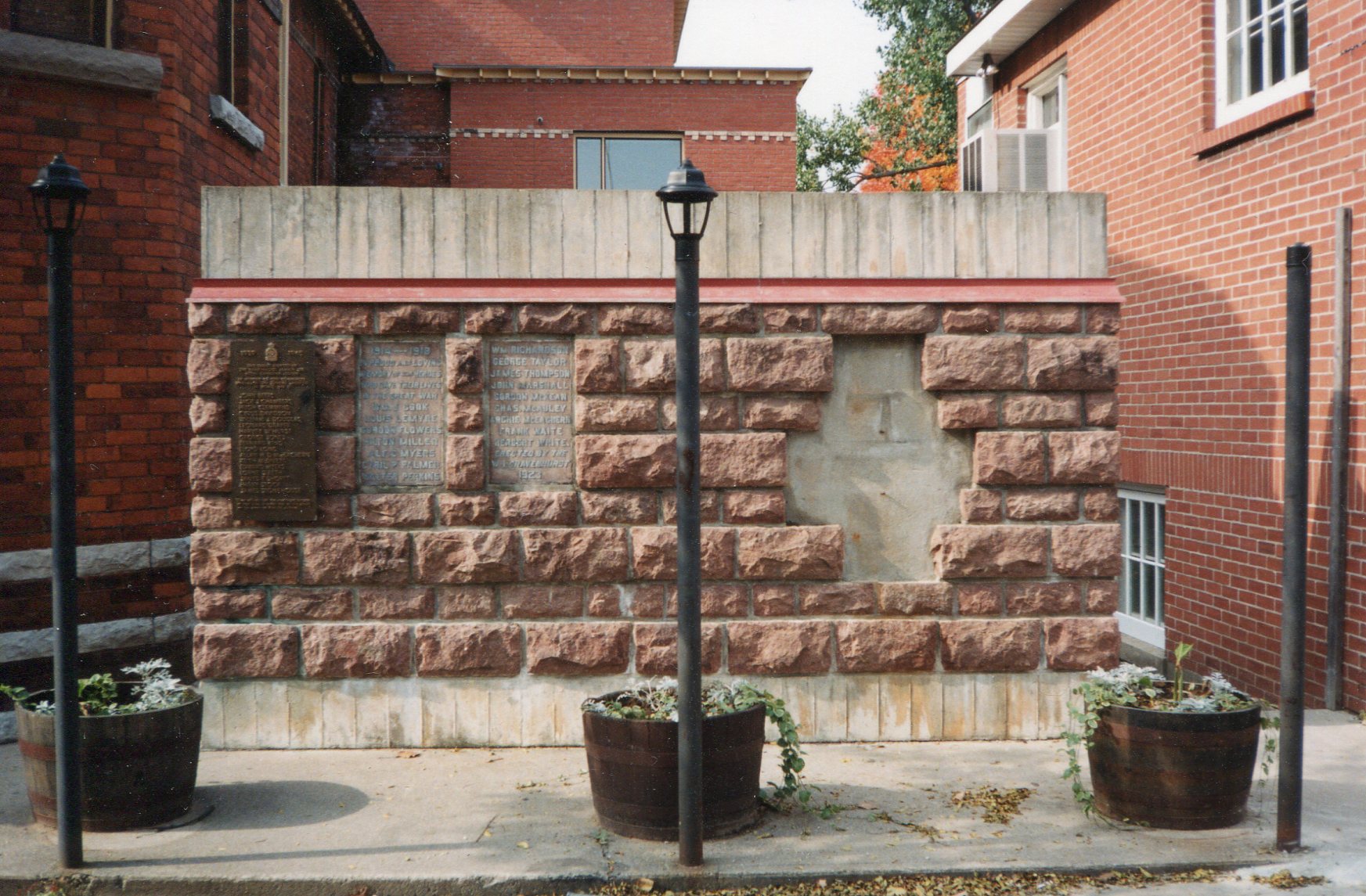 Le Women Institue a embauché Bert Hawker, un vétéran, pour dessiner deux piliers qui seraient érigés sur le trottoir de l’entrée de l’opéra/mairie/bureaux du conseil municipal. Les piliers mesuraient neuf pieds de haut, étaient faits de granit de Muskoka rose et comportaient une lampe fixée à leur sommet de sorte que les noms qui y étaient gravés ne soient jamais dans l’obscurité. Chaque pilier portait une plaque de pierre sur laquelle était gravé le nom des soldats tombés au combat connus à l’époque – 16 hommes. Neil Christenson, un maçon dont les deux fils ont combattu à la Première Guerre mondiale et en sont revenus, a créé les deux piliers de pierre. Le projet a été achevé en 1923.
