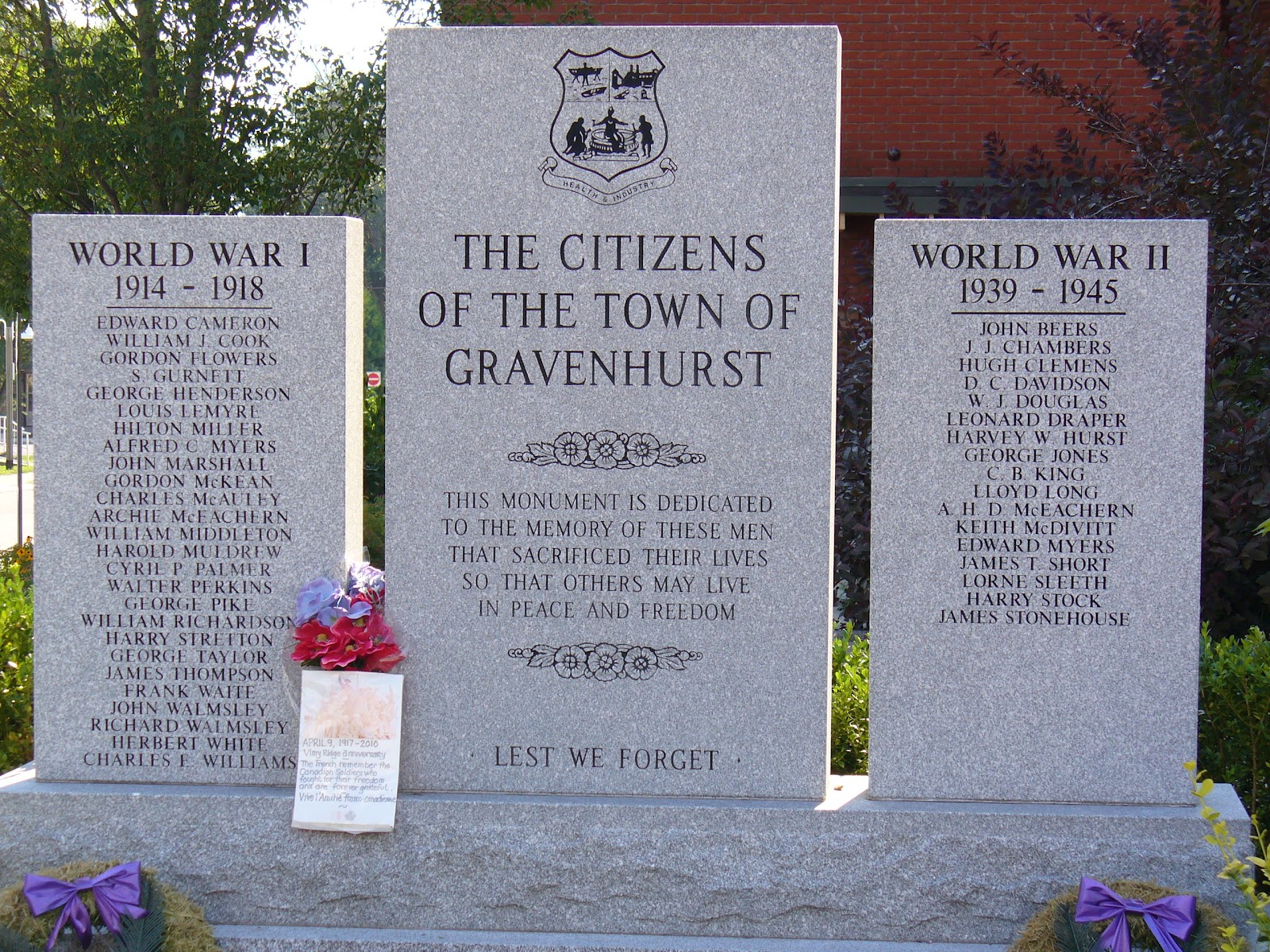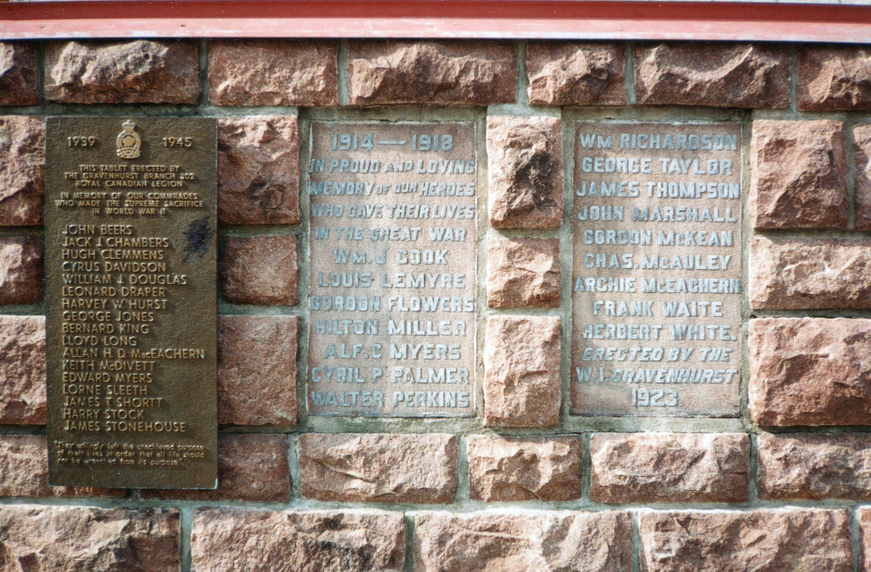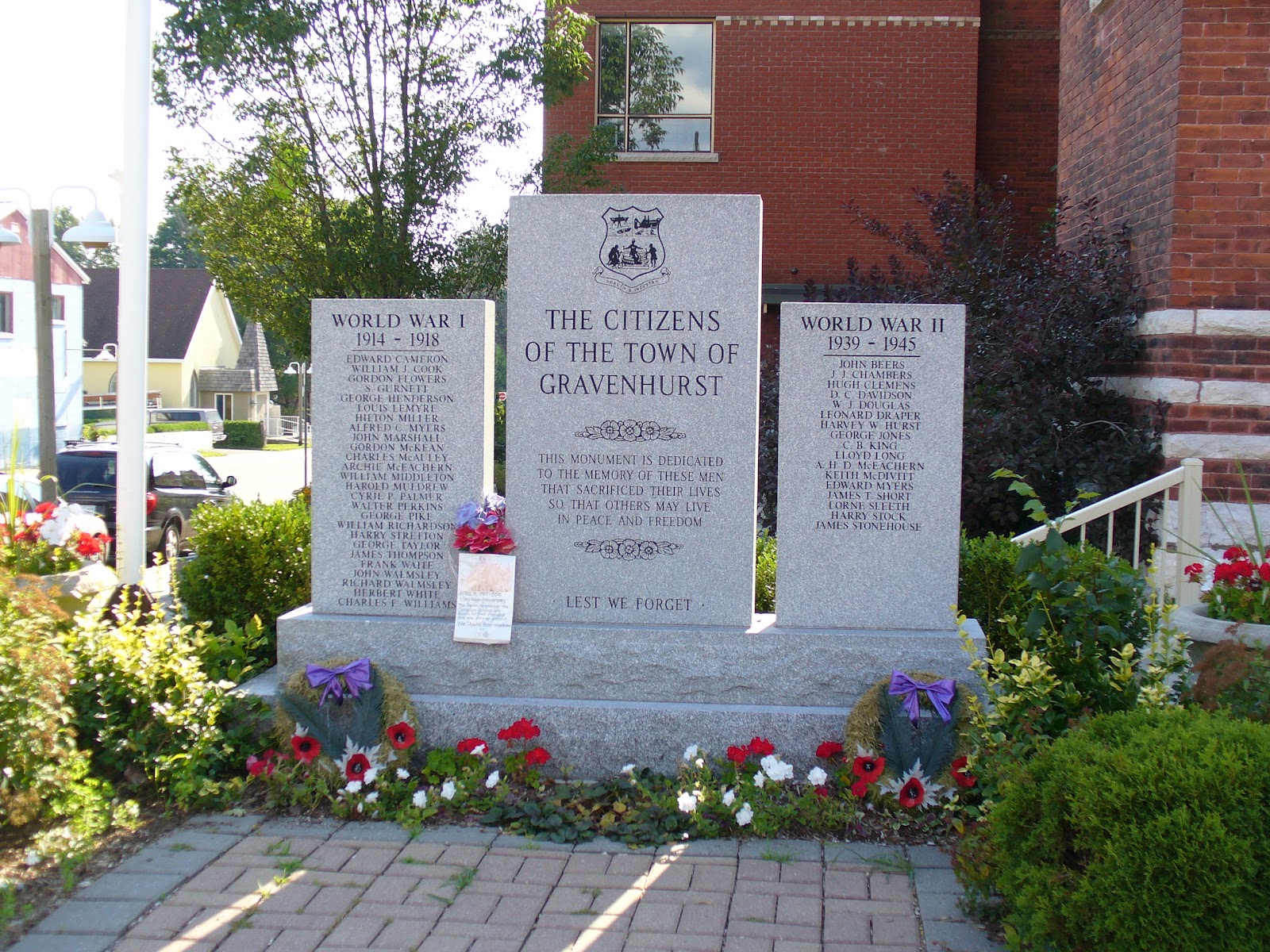 En 1919, la collectivité de Gravenhurst a convenu d’ériger un monument en hommage aux soldats tombés au combat au cours de la Grande Guerre. Le Women’s Institute s’est adressé au Conseil en 1923, a collecté des fonds, embauché un homme pour dessiner le plan du monument et un maçon l’a construit.