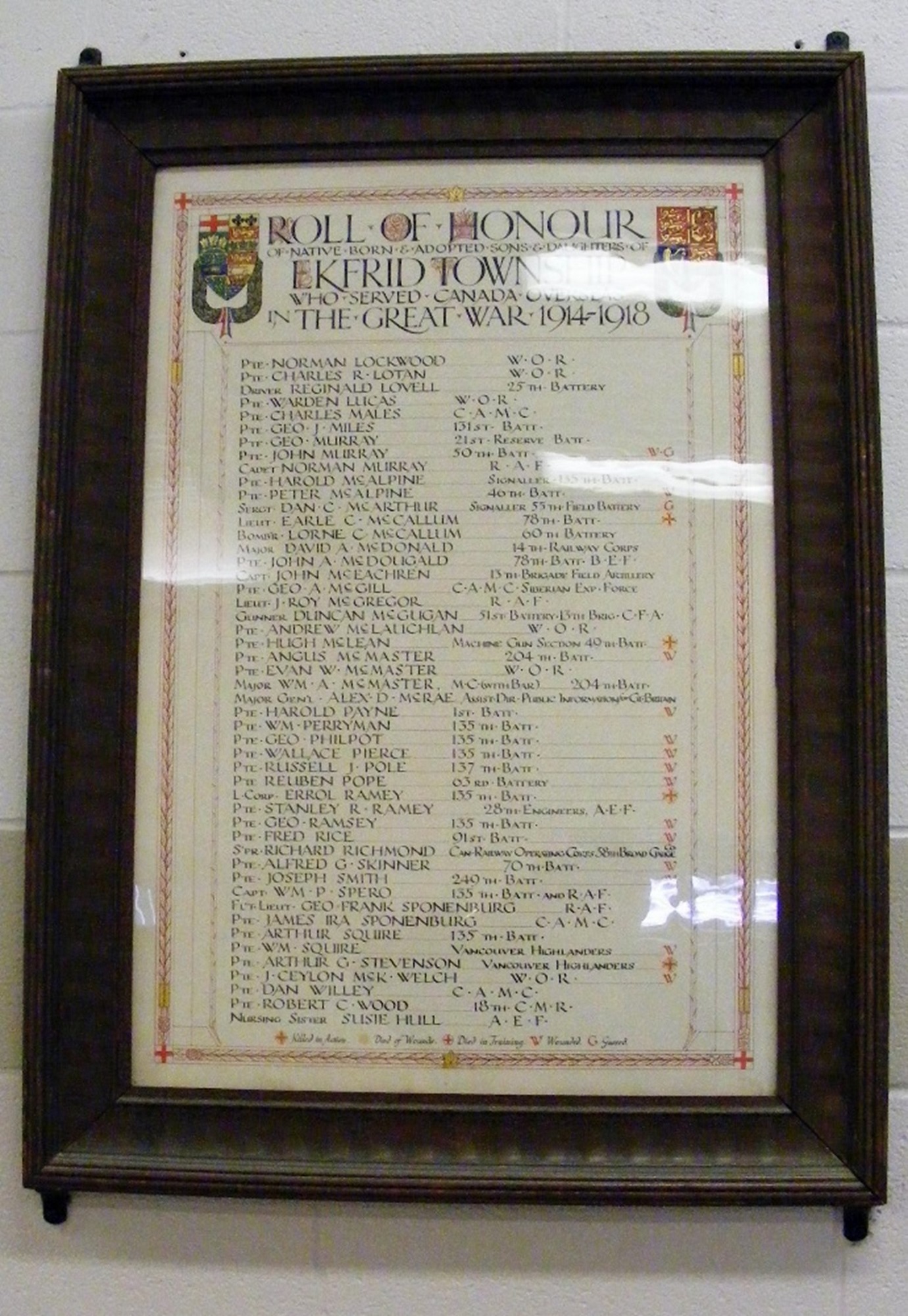 Ce mémorial est dédié aux hommes du canton d’Ekfrid tués au combat pendant la Première Guerre mondiale. Il a été érigé par le conseil du canton.