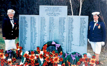 Ce mémorial, érigé par les Dames auxiliaires de la filiale no 75 de la Légion royale canadienne, est dédié aux anciens combattants et aux morts de la guerre originaires de la localité. Il a été érigé par la Heritage Memorial Ltd. de Windsor (N.-É.). C’est Ruth Fahey, membre des Dames auxiliaires, qui a eu l’idée de faire ériger un mémorial à la Légion. Susan Petley (la présidente de l’époque) a distribué des brochures et publié des annonces dans les médis pour recueillir les noms des soldats de la région – hommes et femmes – qui avaient perdu la vie en service. Les Dames auxiliaires ont bientôt eu une liste de 250 noms, alors que le mémorial qu’elles avaient commandé ne pouvait en contenir que 100. Elles ont donc dû commander deux ailes pour y inscrire le reste des noms. Elles ont reçu du financement du gouvernement provincial et du fonds des services communautaires du commandement du Nouveau-Brunswick, de même que des dons. Le mémorial, qui a coûté 3 975 $, a été inauguré le 11 novembre 1995 par Susan Petley et Alan Graham. Environ 250 personnes étaient présentes. La présidente de la campagne du coquelicot, Sheila Handrahan, préside chaque année, dans la salle de la Légion pleine à craquer, la cérémonie commémorative du jour du Souvenir.