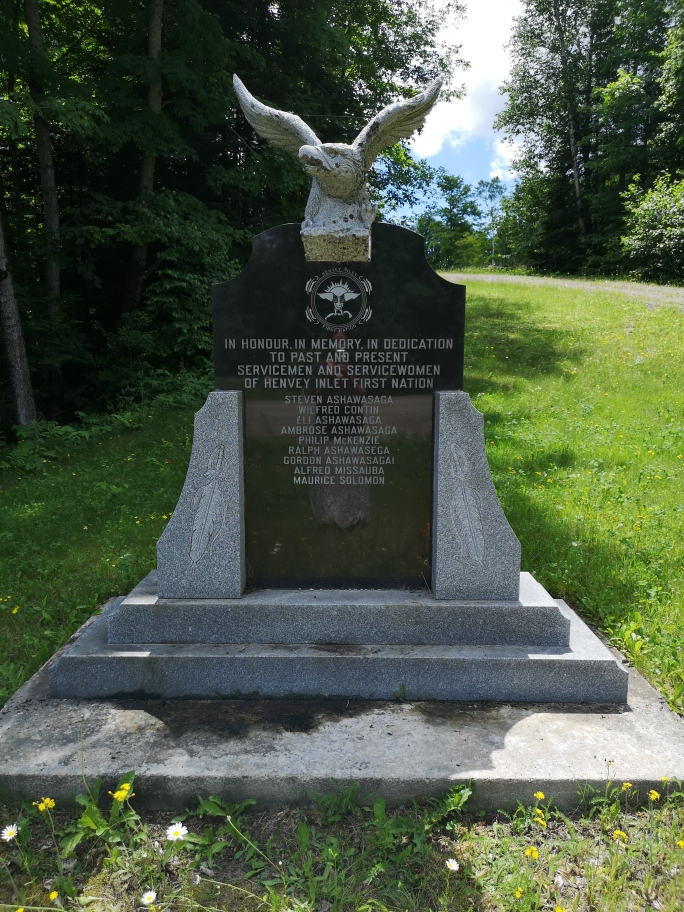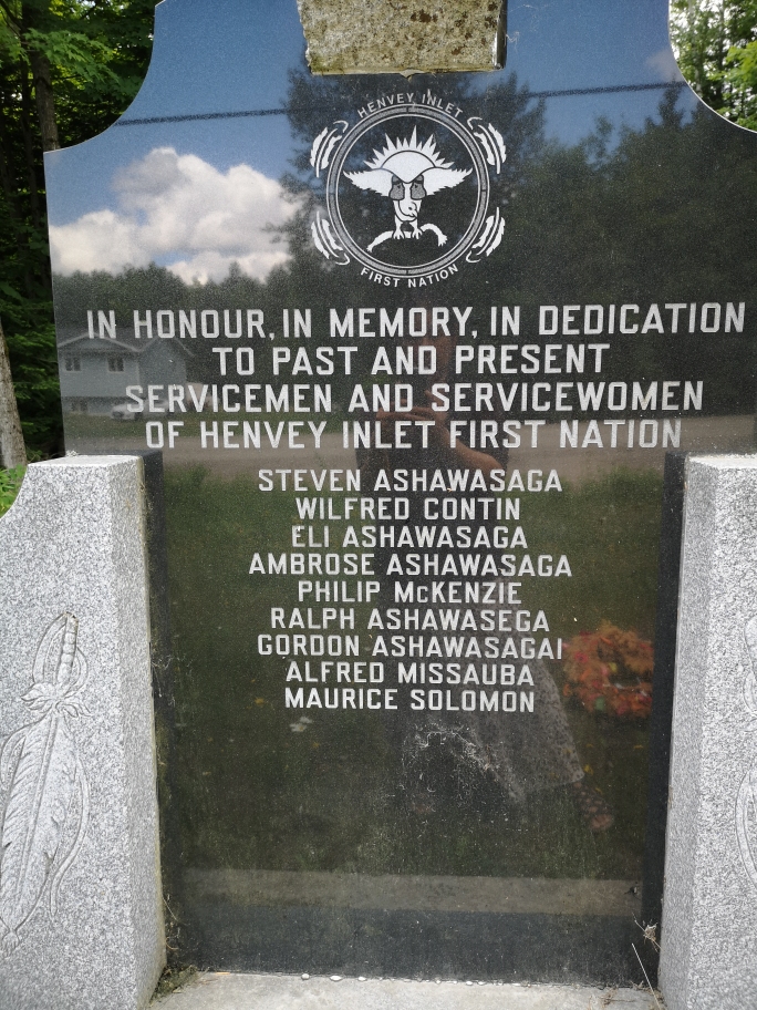 Le monument commémoratif des vétérans de la Première Nation de Henvey Inlet a été érigé en 2010 grâce aux dons de généreux donateurs et résidents. Nick Spanish a participé à la planification concernant le monument commémoratif et à la collecte des noms à inscrire. L’aigle, symbole de la Première Nation de Henvey Inlet, trône au sommet du monument commémoratif.