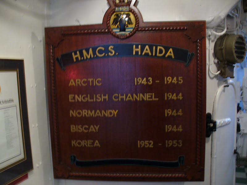 Le HAIDA est demeuré à la Place de l’Ontario jusqu’en décembre 2002, après quoi ce vénérable vaisseau de guerre a été remorqué vers la cale sèche de Port Weller. Il y a fait l’objet de travaux préparatoires avant son déménagement définitif dans le port de Hamilton. Honneurs de guerre du HAIDA : Arctique, 1943-1945; Manche, 1944; Normandie, 1944; Golfe de Gascogne, 1944; Corée, 1952-1954. (Remerciements à Jerry Proc, des Friends of HMCS HAIDA, et au cdr (ret) Peter Johnston pour son article dans « La Feuille d`érable», 15 janvier 2003) http://www.pc.gc.ca/lhn-nhs/on/haida/index_E.asp