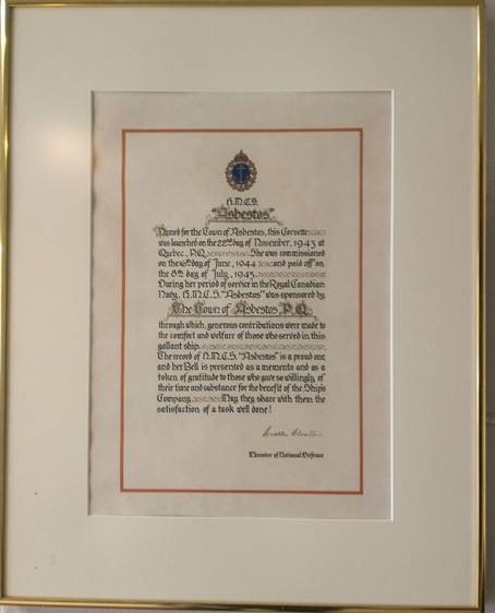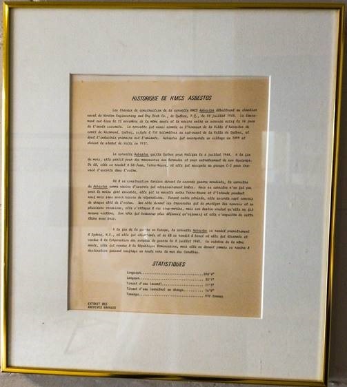 Ces certificats et images présentent des renseignements historiques sur l’ancien NCSM Asbestos. Ils ont été montés et encadrés par la ville d’Asbestos.
