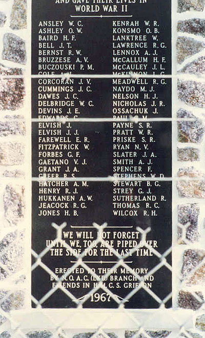 ERECTED TO THEIR MEMORY BY N.O.A.C. (LKD) BRANCH AND FRIENDS IN H.M.C.S. GRIFFON