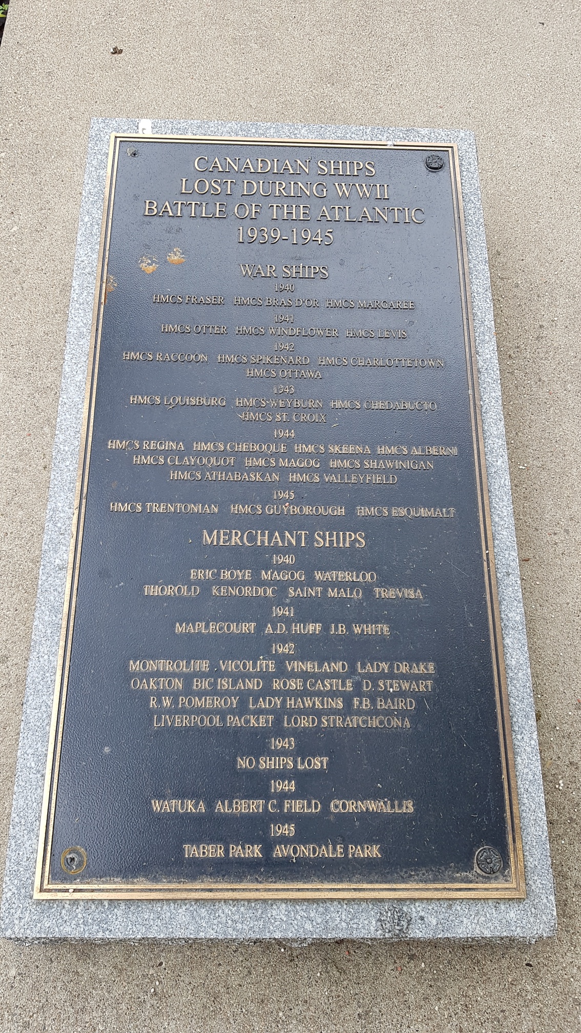 The plaque dedicating the monument to “the Prairie Sailor” was added for the Battle of the Atlantic in May 1990. In May 2009, the two side plaques were added in memorial to the Battle of the Atlantic.