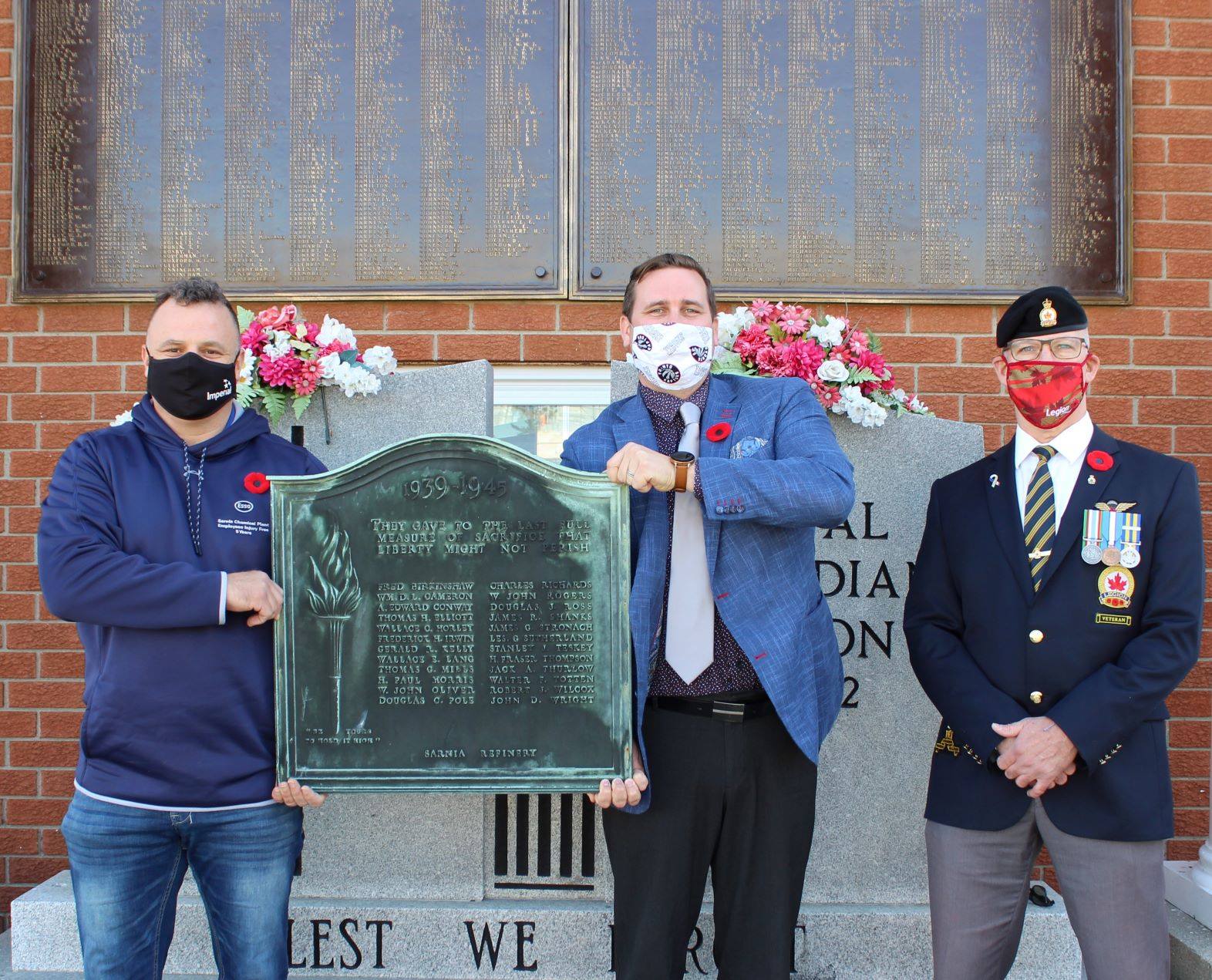 Honour Roll being donated. L-R: Matt Balog from Imperial Oil, and Ron Smith & Les Jones from the Sarnia Legion