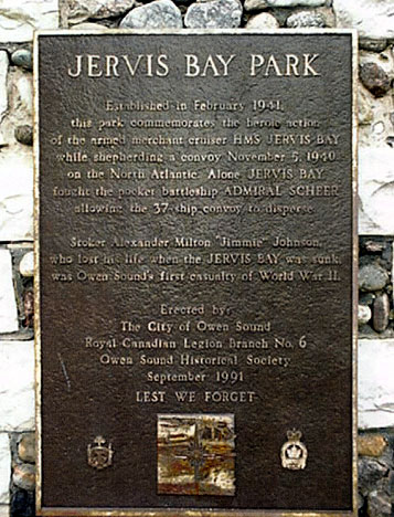 Ce mémorial est dédié au HMS (Her Majesty's Ship) Jervis Bay et à Alexander Milton « Jimmie » Johnson. Il a été érigé en septembre 1991 par la Ville d’Owen Sound, la filiale no 6 de la Légion royale canadienne et la société d’histoire d’Owen Sound.