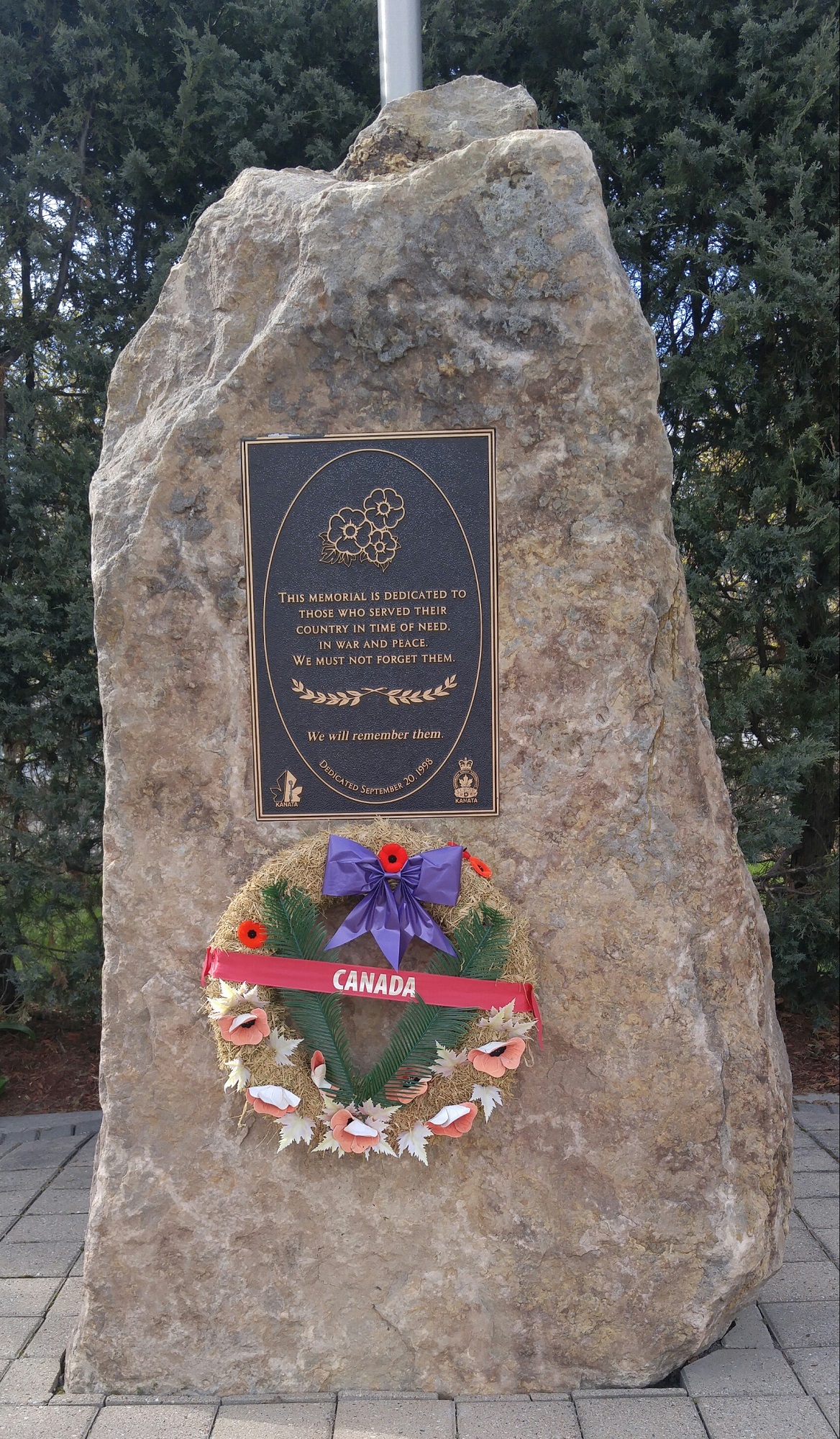 La recherche d’une pierre appropriée pour constituer l’élément central du cénotaphe a été couronnée de succès en octobre 1997. La Ville de Kanata a entreposé la pierre en lieu sûr en attendant que la compagnie Urbandale Developments soit prête à la mettre en place dans le parc commémoratif Village Green. Les travaux ont commencé sur le site en avril 1998. Les progrès rapides ont permis aux promoteurs et à la Légion d’en fixer la date d’achèvement au 18 septembre 1998, l’inauguration devant avoir lieu le 20 septembre. Le texte figurant sur la plaque a été approuvé à l’occasion d’une assemblée générale de la Légion.