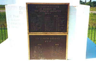 Érigé en 1919 par le village de Kelliher en hommage aux citoyens morts durant la Première Guerre mondiale, ce mémorial a été modifié par l'ajout de deux plaques de métal. La première remplace les noms inscrits sur la base en béton de l'obélisque, sérieusement endommagée par les intempéries. La seconde plaque inclut les noms des citoyens de la localité morts durant la Seconde Guerre mondiale.