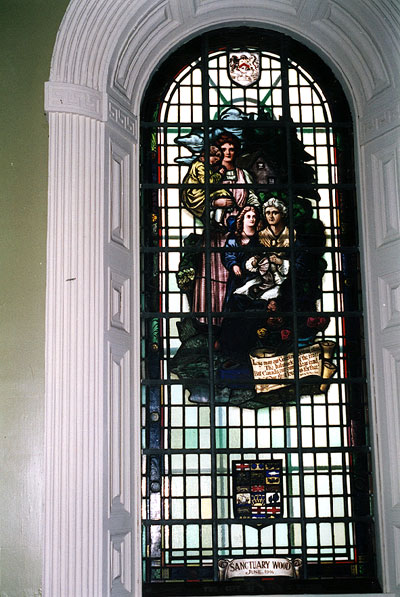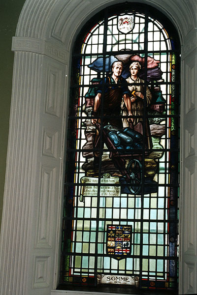 Ce vitrail, comme celui de la Somme, est l’œuvre des studios McCausland et rappelle la mémoire des épouses qui ont laissé partir leurs maris et des mères qui ontlaissé partir leurs fils. Pendant la guerre, plus de 110 000 familles ont reçu une allocation de séparation et 60 000 familles ont bénéficié du Fonds patriotique.