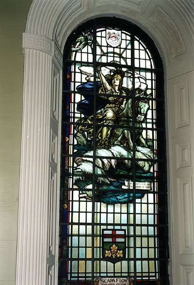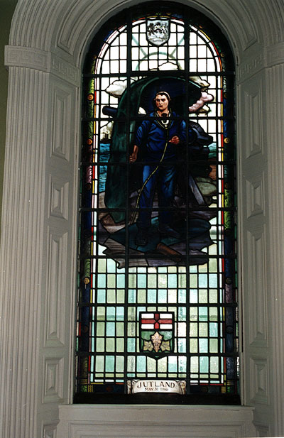Ce vitrail évoque l’héroïsme de l’aspirant de marine britannique. Lors de la bataille du Jutland, tous les membres de l’équipe de tir de l’un des croiseurs furent tués et, après l’engagement, Jack Cornwell fut retrouvé grièvement blessé à son poste. Lorsqu’on lui demanda pourquoi il n’était pas parti, sa réponse fut typique d’un marin britannique : « J’ai pensé qu’on pourrait avoir besoin de moi. » [Traduction libre] Il est mort des suites de ses blessures peu après l’engagement. Sa mère a reçu la Croix de Victoria.