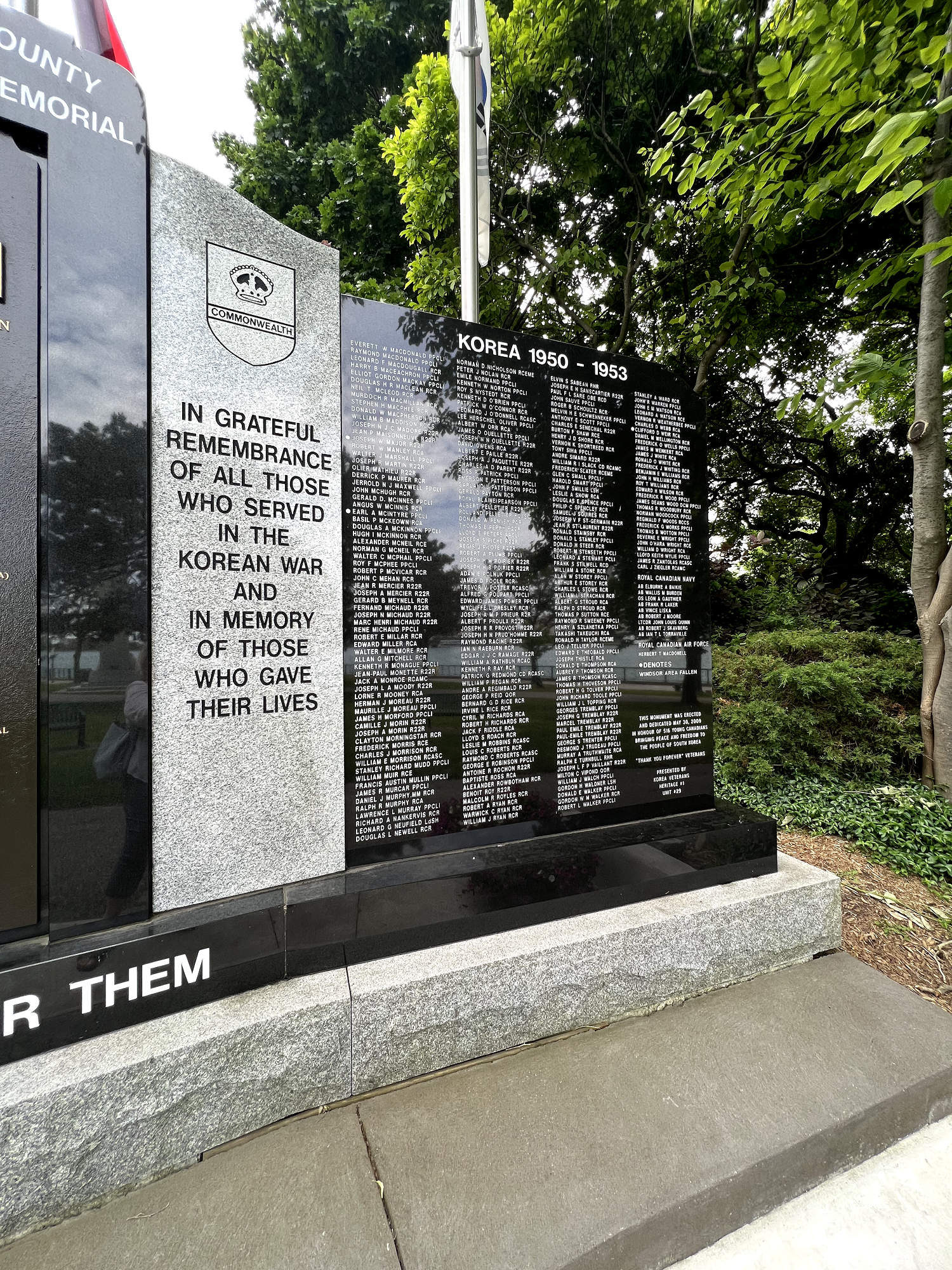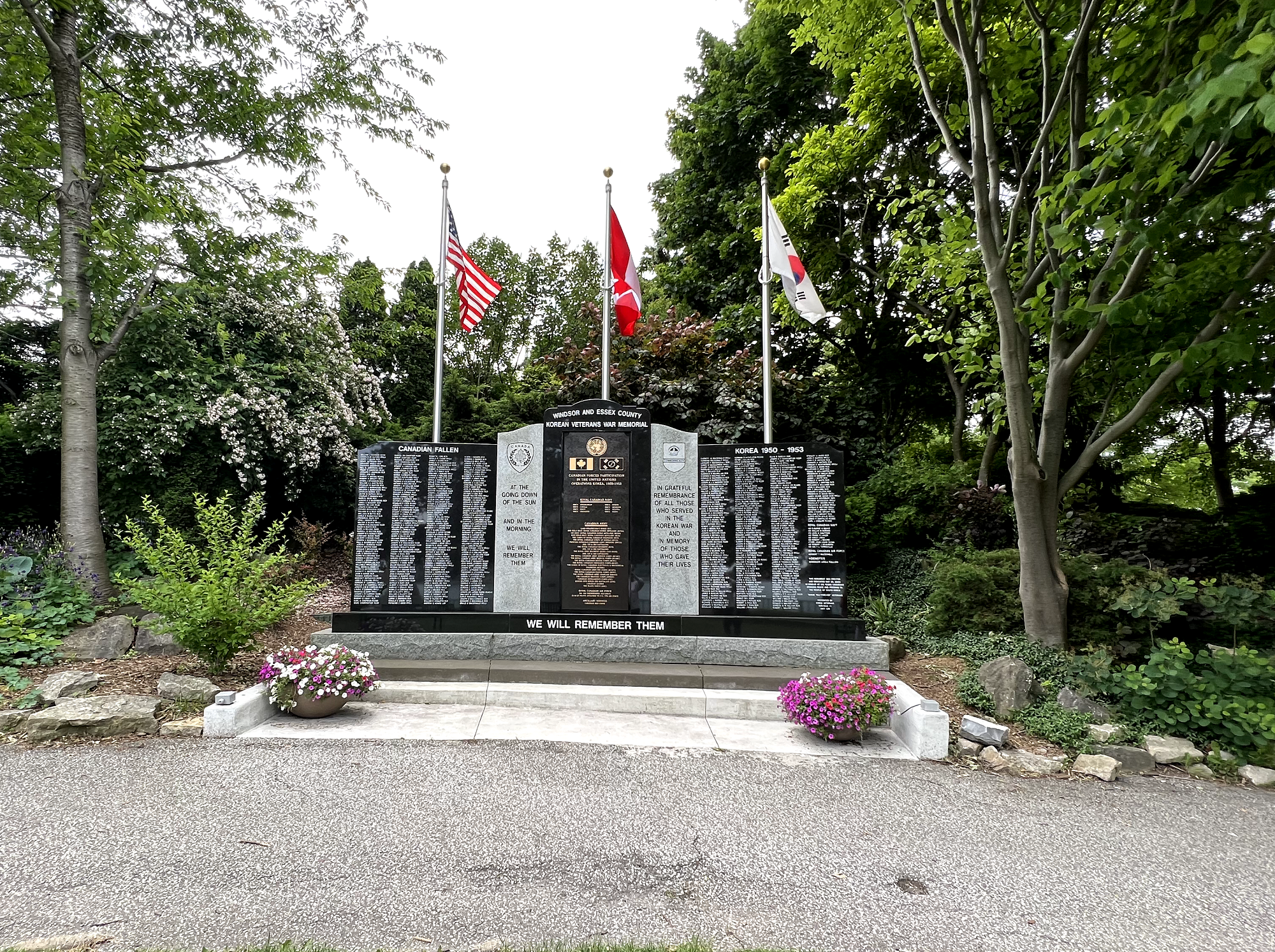 The Korean Veterans War Memorial was unveiled May 30, 2009, in recognition of the sacrifices of Canadian soldiers in the Korean war. It was installed by Hallmark Memorial Co. The granite and bronze monument contains the names of all 516 Canadians killed in the Korean War with the names of the Windsor-Essex casualties specially noted.