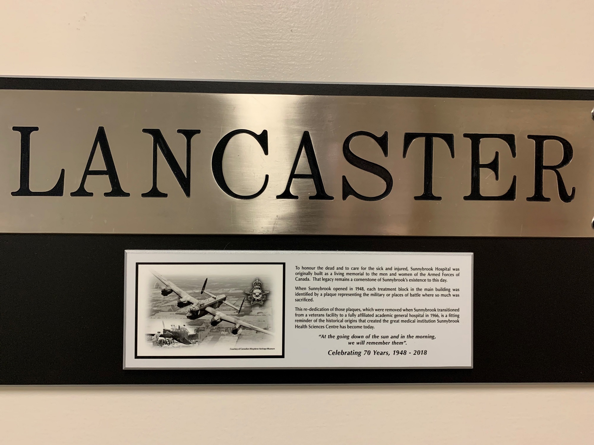 Lorsque l’hôpital militaire Sunnybrook a ouvert ses portes en 1948, chaque bloc de traitement du bâtiment principal était identifié par une plaque représentant des militaires ou des lieux de bataille où tant de sacrifices ont été consentis. Bien que les plaques aient été retirées lorsque Sunnybrook est passé du statut d’établissement pour vétérans à celui d’hôpital général universitaire entièrement affilié en 1966, elles ont été inaugurées à nouveau en 2018. L’aile Lancaster est actuellement appelée Aile C.