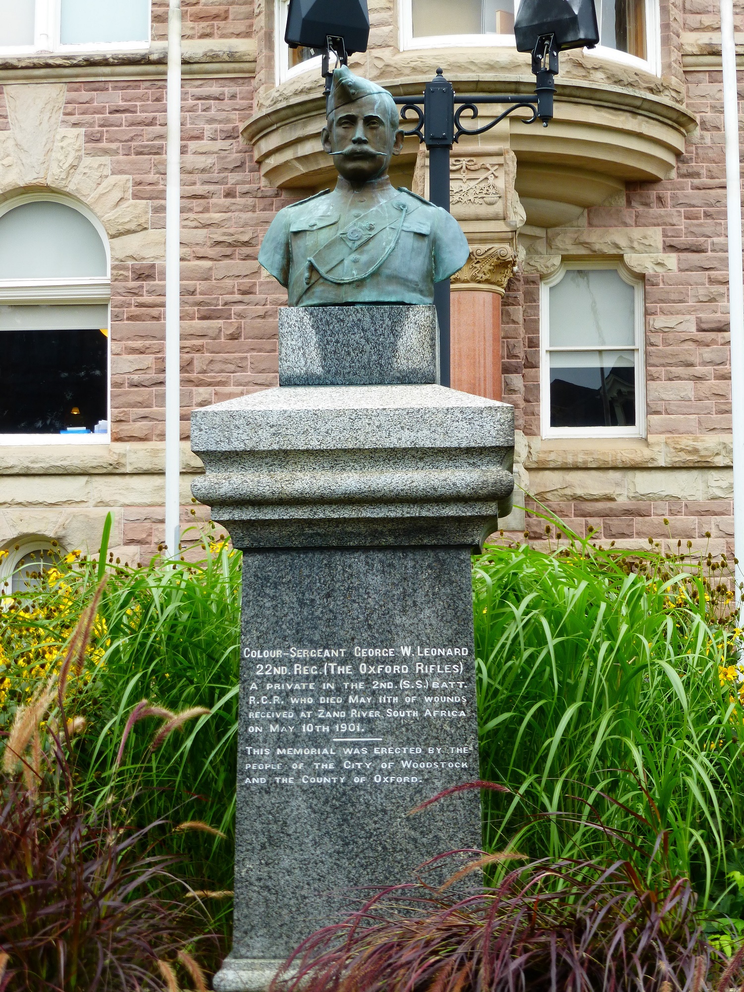 Durant la guerre d’Afrique du Sud, le sergent fourrier G.W. Leonard est tombé au combat le 11 mai 1900, alors que le caporal M. Davidson est mort de fièvre entérique le 9 février 1902. Le buste du sergent fourrier Leonard trône devant le Palais de justice, mais il a été érigé à la mémoire des deux hommes et dévoilé le 24 mai 1904. Il a été créé par le sculpteur de Beachville, Frederick C. Dunbar et érigé par les habitants de la ville de Woodstock et du comté d’Oxford. Le monument a été dévoilé lors de la visite du 13e Régiment de Hamilton et Lord Aylmer, adjudant général de la Milice canadienne, a présidé la cérémonie. Les sergents Lane, Wiltshire et McGinnis des Fusiliers d’Oxford ont procédé au retrait des drapeaux couvrant le mémorial.