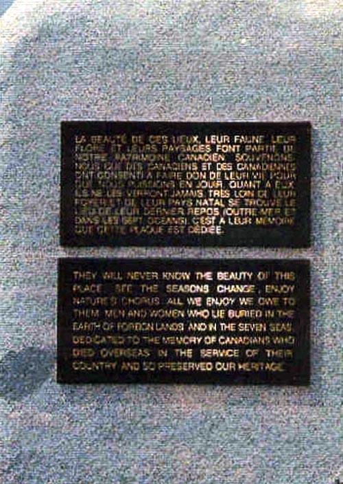 La beauté de ces lieux, leur faune, leur flore et leurs paysages font partie de notre patrimoine canadien. Souvenons-nous que des Canadiens et des Canadiennes ont consenti à faire don de leur vie pour que nous puissions en jouir. Quant à eux, ils ne les verront jamais. Très loin de leur foyer et de leur pays natal se trouve le lieu de leur dernier repos (Outre-mer et dans les sept océans). C'est à leur mémoire que cette plaque est dédiée.