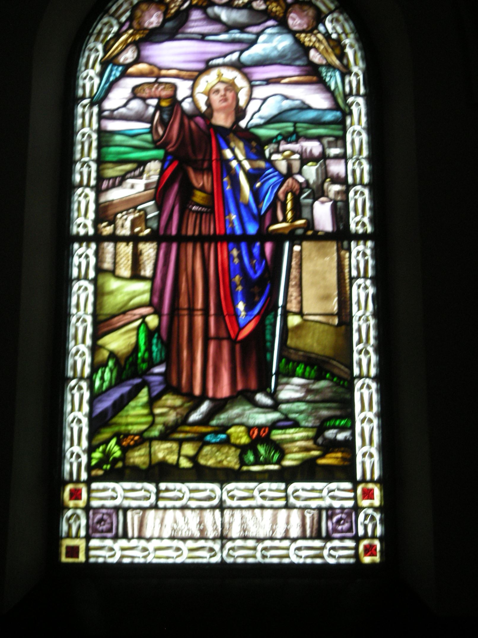 Grand vitrail d’environ 4 pi sur 10 pi représentant une image de Saint-Louis-de-France. Il a été créé par l’artiste-verrier renommé de Montréal Guido Nincheri, dont le nom est visible en haut et à droite de l’inscription. L’église compte 21 œuvres de Guido Nincheri, constituant ainsi la plus importante collection à l’est de Montréal en une seule église.