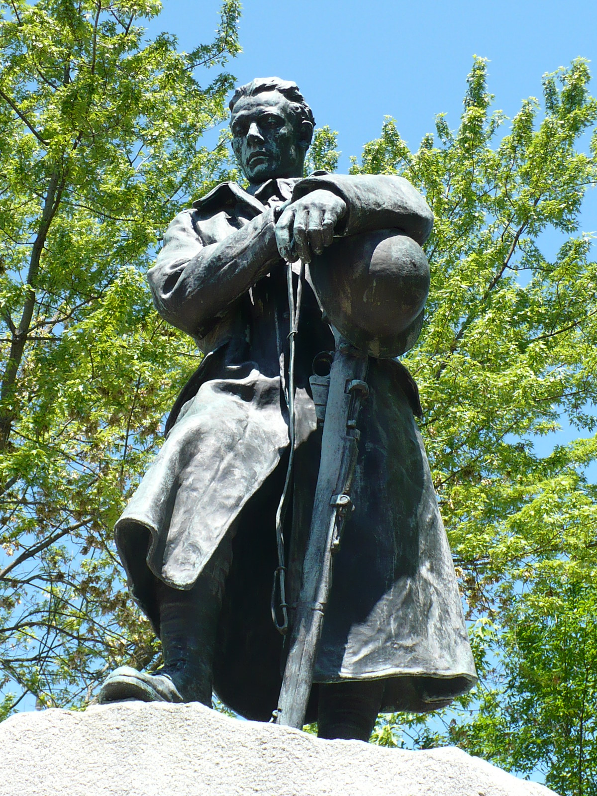 La conception de Emmanuel Hahn représente les chagrins causés par la guerre. Le soldat au sommet du cénotaphe regarde avec tristesse le sol à ses pieds, comme s’il pouvait y trouver ses camarades tombés au combat, sinon en raison de la tragédie de la guerre. La statue en bronze représente un jeune soldat canadien en deuil, vêtu d’un manteau d’hiver. Il tient sa main droite et son bras gauche sur son casque, lui-même posé sur son fusil, le canon vers le bas et son casque est accroché à son avant-bras gauche.