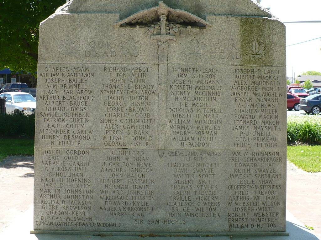 Sir Sam Hughes, ministre canadien de la Milice et de la Défense d’octobre 1911 à novembre 1916, a vu son nom figurer parmi les morts de la Première Guerre mondiale sur le cénotaphe de Lindsay, même s’il n’est mort qu’en 1921. Lindsay était sa ville natale, où il avait été instituteur et rédacteur en chef et propriétaire du journal.