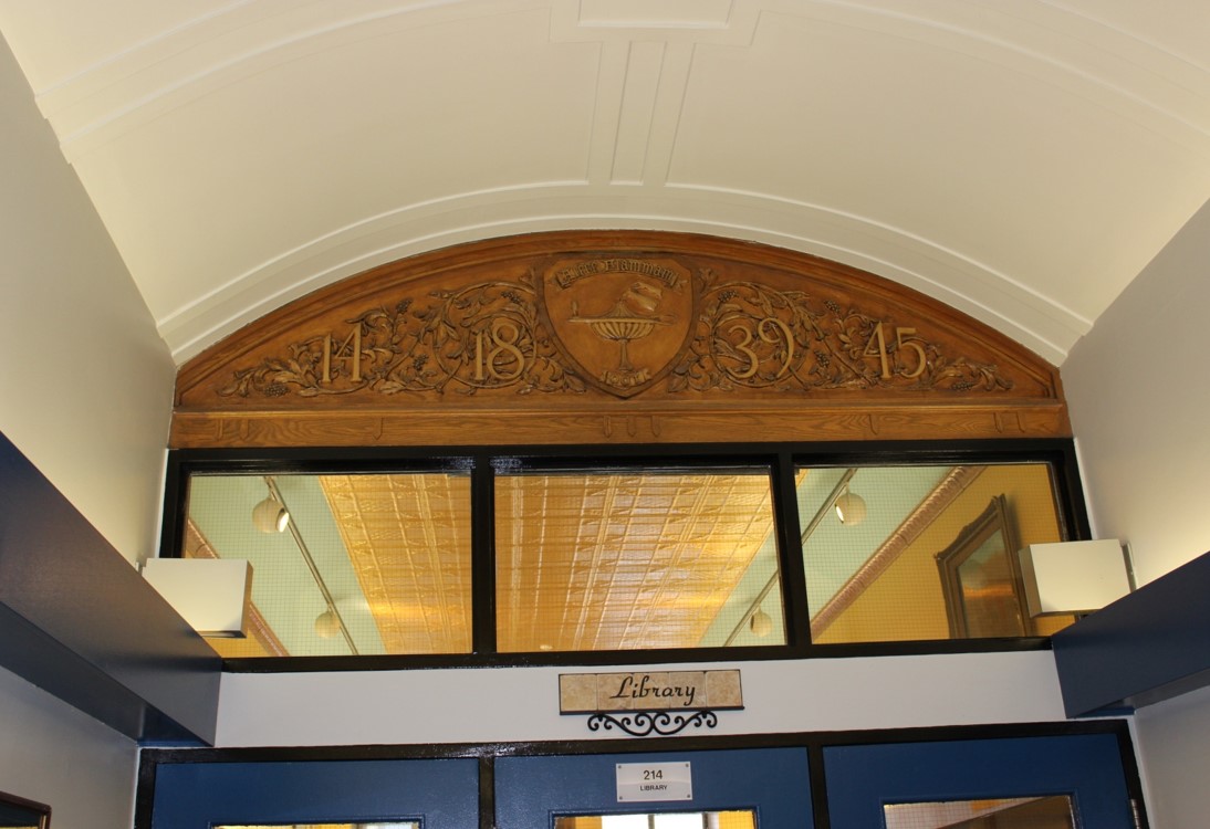 Ce monument commémoratif est dédié aux membres du Lisgar Collegiate Institute qui ont servi pendant les Première et Seconde Guerres mondiales. Il s’agit d’un grand panneau de chêne sculpté en arc à l’entrée de la bibliothèque, avec l’emblème de l’école au milieu et les chiffres « 14, 18 » « 39, 45 », gravés de chaque côté de l’emblème.