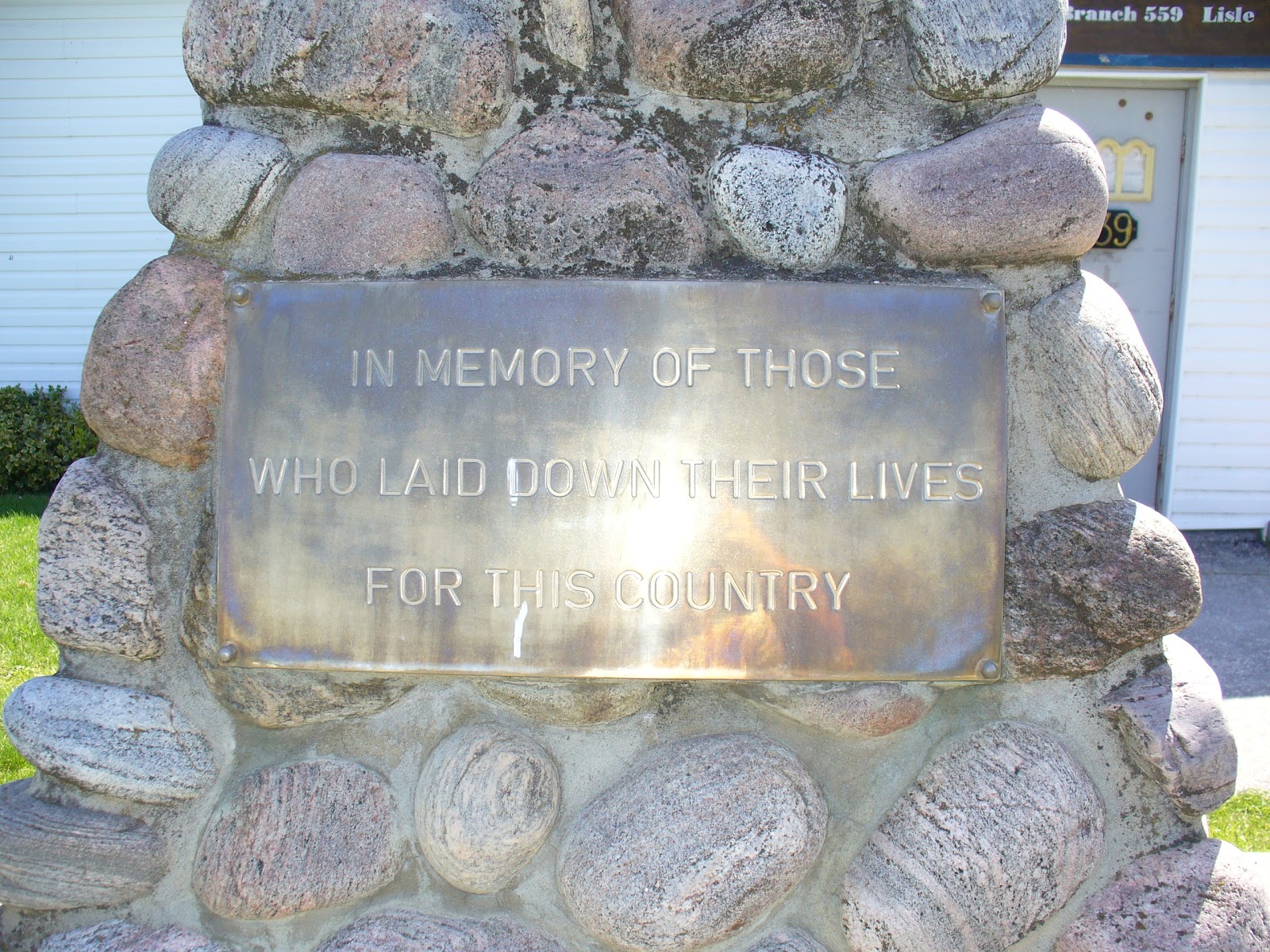 Ce monument a été érigé en août 1968 à la mémoire des anciens combattants canadiens, et en particulier de ceux de la région. Après la création de l’actuelle filiale de la Légion à Lisle, on a décidé d’honorer, par un mémorial ou une autre marque de reconnaissance, les anciens combattants et les soldats morts pour leur pays. Cette construction était particulièrement nécessaire pour les cérémonies commémoratives du 11 novembre et les autres services qui se tenaient à l’extérieur. Tant à la première filiale de la Légion (Railroad Station) que dans les premières années de la filiale actuelle, on utilisait une grande plate-forme carrée en bois pour la réception du salut et la relève de la garde au cours de la portion extérieure des services commémoratifs. Le sgt Vince Sulllivan, qui avait construit le cénotaphe du parc Worthington, à la base de Borden, a été invité en 1968 à construire un monument similaire pour la Légion de Lisle. Il a consenti à le réaliser gratuitement, se contentant de réclamer quelques personnes pour l’aider. Il avait toujours les formes du monument qu’il avait construit à Borden, ainsi que quelques sacs de ciment et le colorant nécessaire. C’était une bonne nouvelle pour la Légion et, après une semaine de travaux en soirée, le monument a été terminé le même été. À l’exception du sgt Sullivan, tous ceux qui ont participé à la construction du mémorial étaient membres de la Légion de Lisle. Le texte à inscrire sur la plaque de laiton est un des éléments qui ont soulevé le plus de controverse. Certains membres voulaient y faire inscrire « For King and Country » (Pour le Roi et la Patrie), d’autres préféraient « Commonwealth and Country » (Commonwealth et Patrie), tandis que d’autres encore jugeaient que les mots « British Empire » (Empire britannique) conviendraient mieux. Enfin, d’autres souhaitaient omettre toute allusion à la monarchie. Finalement, après deux réunions et un long débat houleux, les mots suivants ont été choisis : « IN MEMORY OF THOSE WHO LAID DOWN THEIR LIVES FOR THIS COUNTRY » (À LA MÉMOIRE DE CEUX QUI ONT DONNÉ LEUR VIE POUR LEUR PAYS) Voici les noms des membres de la Légion qui ont participé à la construction du mémorial, avec quelques renseignements biographiques à leur sujet : Tom Butler : Né et élevé dans la maison de pierre de la Forth Line, à Lisle, où il a vécu jusqu’à son déménagement à Alliston à l’automne 1996. Vince Sullivan : Retraité de l’armée; vit à Arthurette (Nouveau-Brunswick). Alec Begg : Décédé. Vivait dans la maison, au sud de Lisle, où habite aujourd’hui Elvis Jamieson. Sa fille, Barbara Adams, est membre de la Légion de Lisle, tout comme son mari, Gord, et ses filles, Debra Adams et Dawn Charpentier. Barb Adams habite à Spruce Grove (Alberta). Jim Lane : Décédé. Propriétaire et exploitant du restaurant de Lisle à la fin des années 1950 et au début des années 1960. Claude Patton : Décédé. Agriculteur à l’ouest de Lisle et facteur pour ce secteur pendant des années. Ses fils Bill et Don sont tous deux membres de la Légion de Lisle. Lors d’une assemblée générale, en octobre 1994, il a été décidé que le vieux cénotaphe avait besoin d’une cure de rajeunissement. Un entrepreneur a été embauché pour effectuer les travaux nécessaires. Il a refait la surface de la base sur laquelle repose le cénotaphe et recouvert la surface lisse du cénotaphe de pierres des champs colorées qui mettent encore mieux en évidence cet impressionnant monument. Les travaux ont été complétés le 31 août 1995.