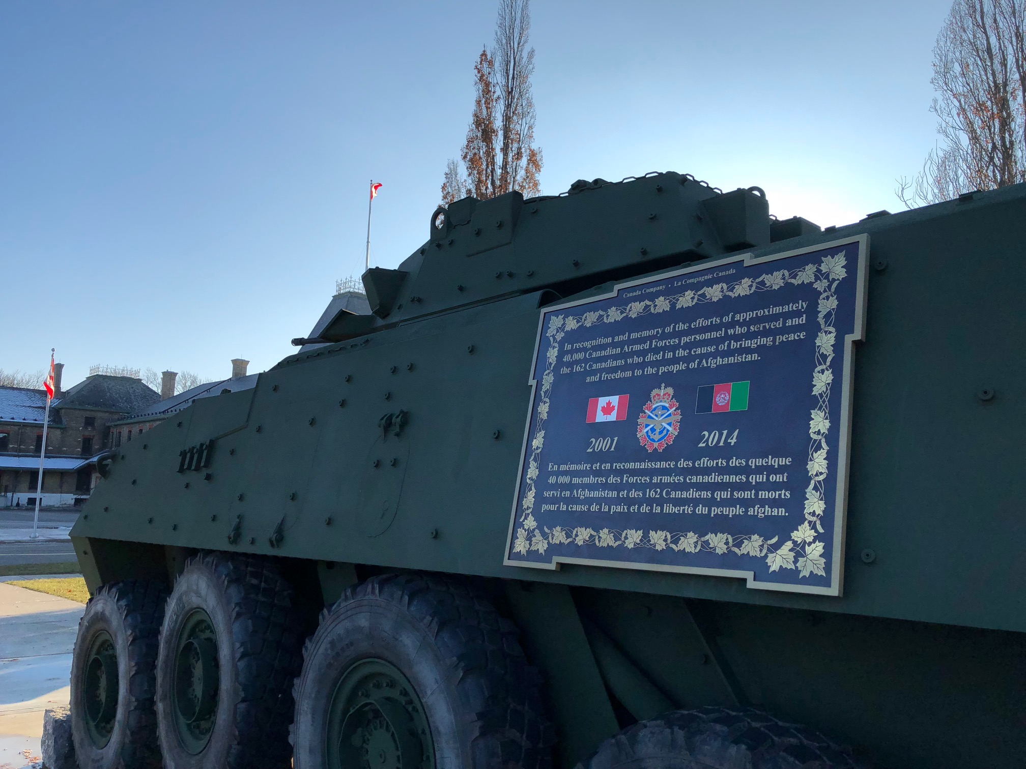 Des dignitaires de la Ville de London, des représentants du 31e Groupe?brigade du Canada, du ministère de la Défense nationale, du Musée du Royal Canadian Regiment, de la Compagnie Canada et du London Heritage Council se sont réunis le 9 novembre 2018 pour dévoiler un monument constitué d’un VBL III pour rendre hommage aux membres des Forces armées canadiennes (FAC) qui ont servi et qui se sont sacrifiés en Afghanistan, entre 2001 et 2014.