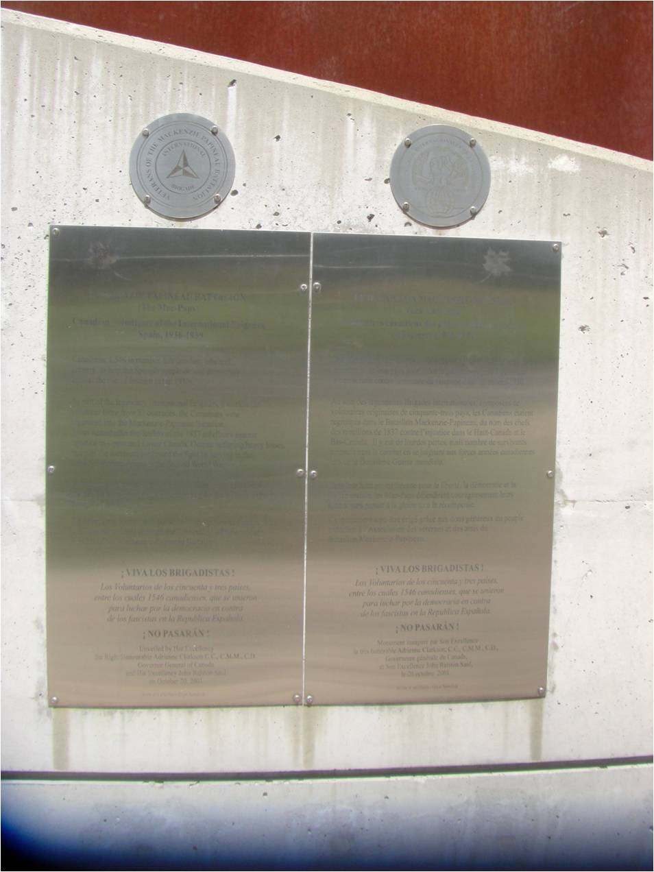 Au sein des légendaires Brigades internationales composées de volontaires originaires de cinquante-trois pays, les Canadiens étaient regroupés dans le Bataillon Mackenzie-Papineau, du nom des chefs des rébellions de 1837 contre l’injustice dans le Haut-Canada et le Bas-Canada. Il y eu de lourdes pertes, mais nombre des survivants poursuivirent le combat en se joignant aux Forces armées canadiens lors de la Deuxième Guerre mondiale.