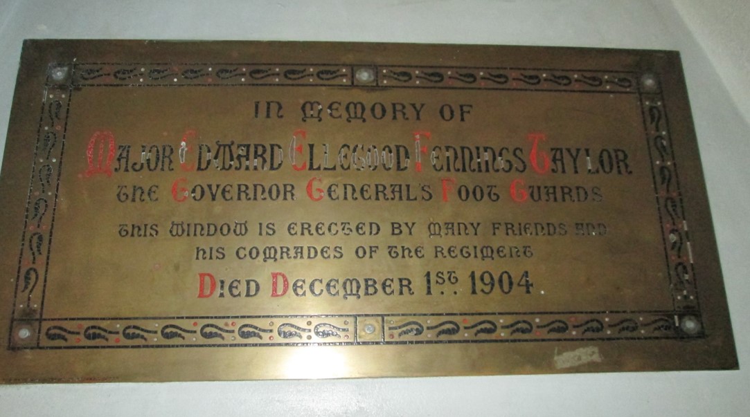 Cet objet commémoratif est dédié au major Edward Ellegood Fennings Taylor. Il a été dévoilé par ses amis et ses camarades de régiment. Il se trouve dans l’église anglicane St. Alban.
