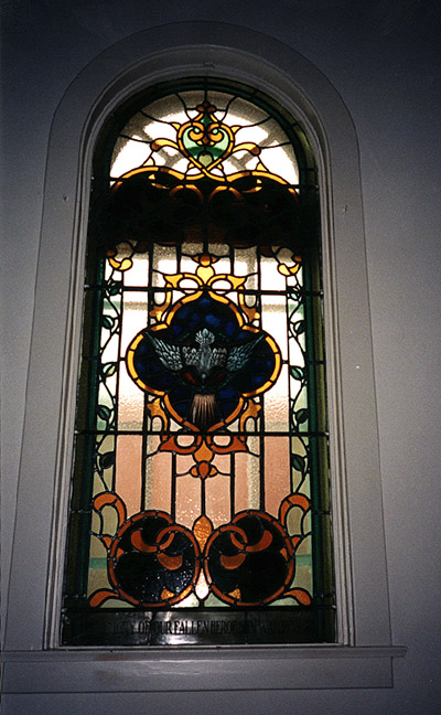 [One single stained glass window, installed in the west wall of the church/un seul vitrail, installé sur le mur ouest de l’église]