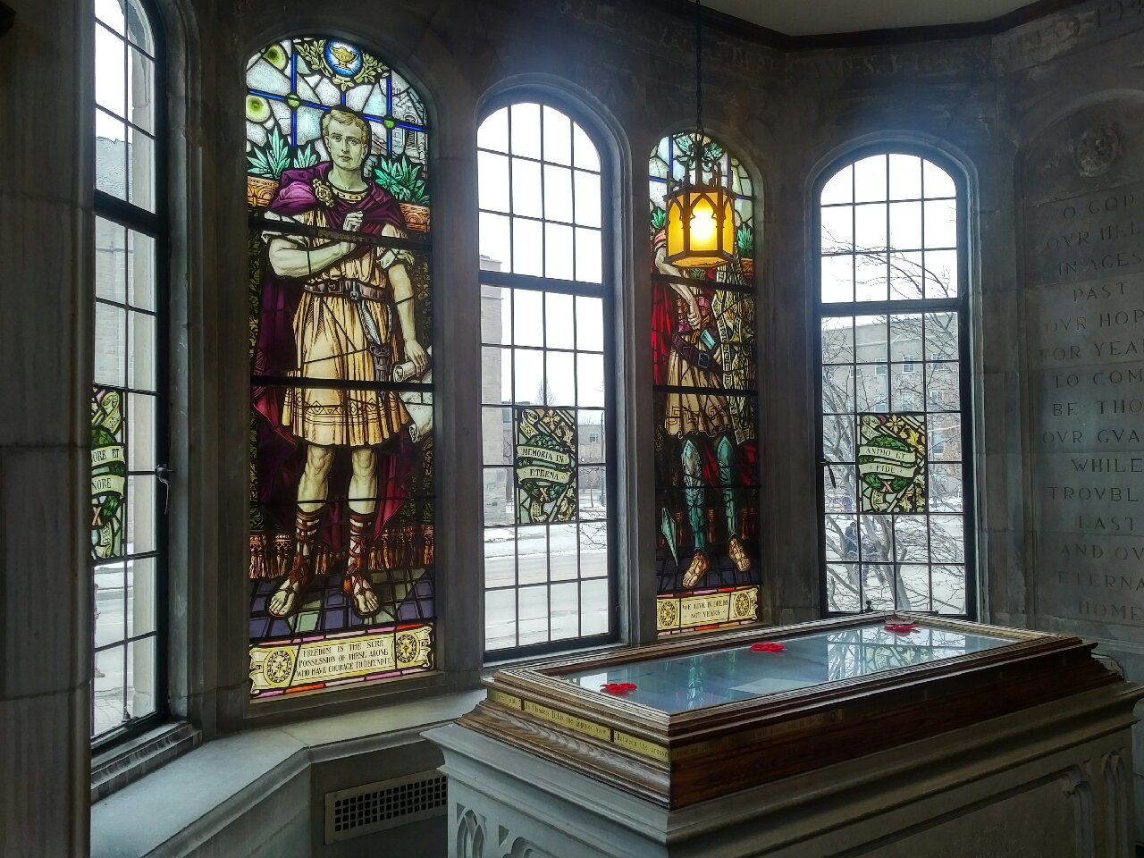 La Salle commémorative rend hommage aux 351 étudiants et anciens étudiants de l’Université Queen's qui ont perdu la vie au cours des Première et Seconde Guerres mondiales. On peut y voir deux grandes plaques en bronze sur lesquelles sont inscrits les noms des étudiants morts au combat, ainsi qu’un autel en pierre, des vitraux et sept peintures à l’huile d’hommes et de femmes de chacune des branches des Forces canadiennes, peintes par l’artiste torontoise Marion Long.