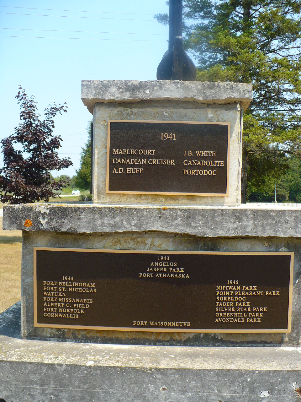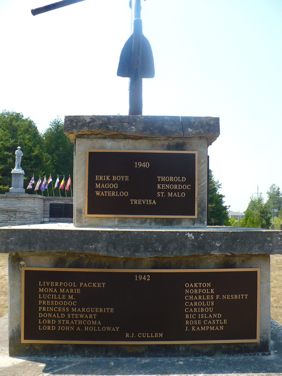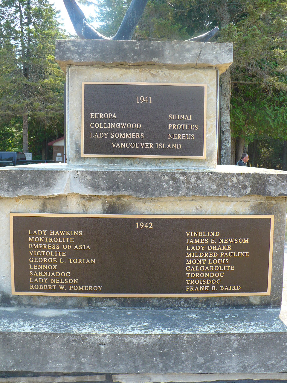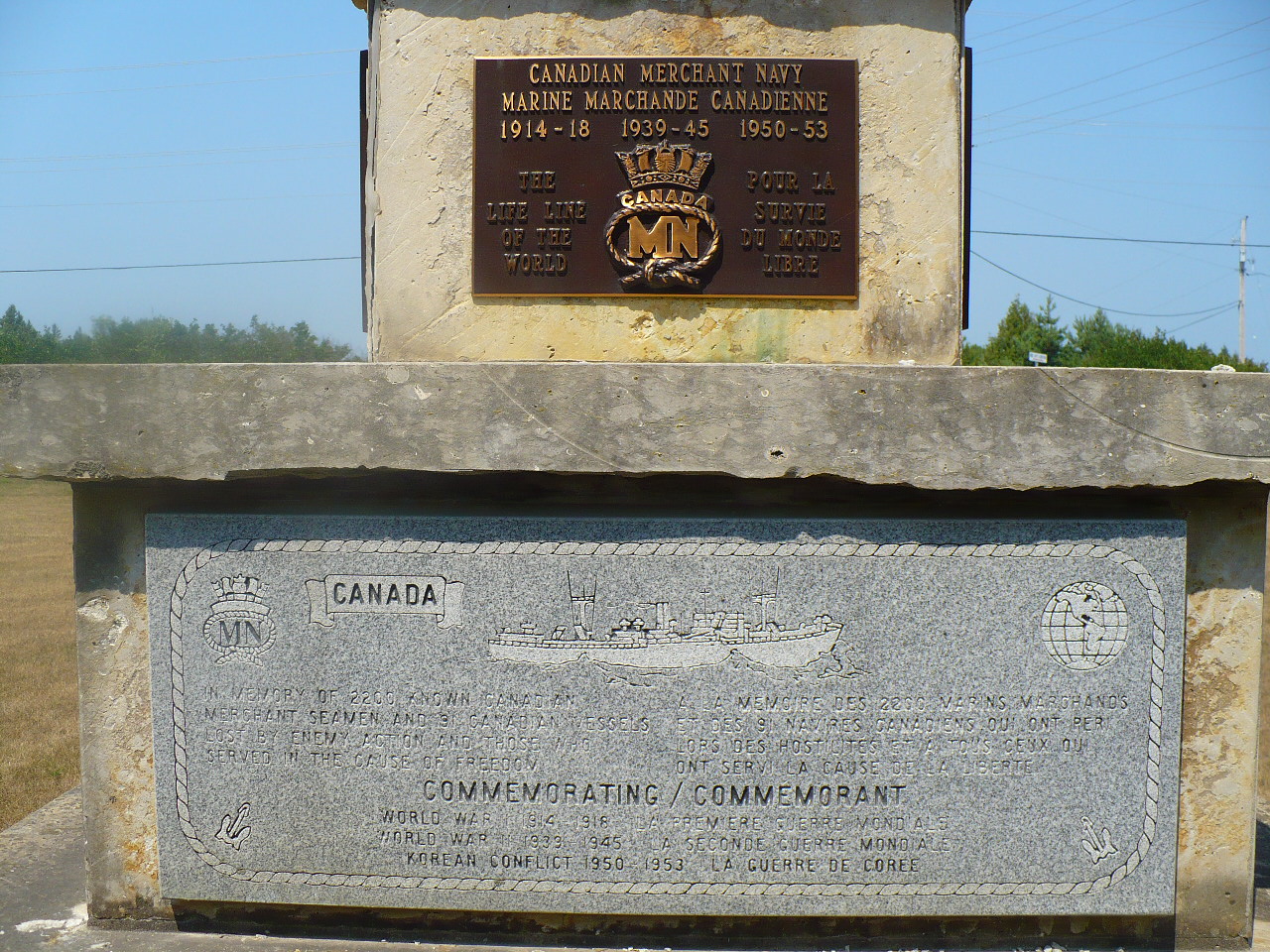 Au printemps 2002, six plaques de bronze nommant les 72 navires marchands perdus pendant la Seconde Guerre mondiale ont été achevées. Trois vétérans de la marine, soit John Bryan, de Providence Bay, Allan Tustian, de Mindemoya et Ed Kift, de Little Current, sont à l’origine de ce monument. Une cérémonie de nouvelle dédicace du Monument commémoratif a eu lieu le 25 mai 2002, où les plaques ont été dévoilées par l’honorable Art Egleton, ministre de la Défense nationale, assisté des camarades Allen Tustian et Norm Smith.