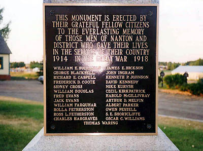 THIS MONUMENT IS ERECTED BY THEIR GRATEFUL FELLOW CITIZENS TO THE EVERLASTING MEMORY OF THOSE MEN OF NANTON AND DISTRICT WHO GAVE THEIR LIVES IN THE SERVICE OF THEIR COUNTRY IN THE GREAT WAR 1914-1918