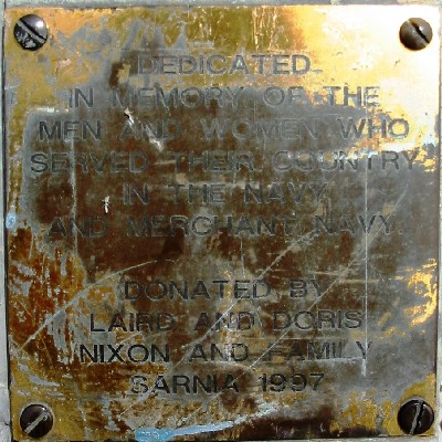 Laird Nixon, un résident de Sarnia, a découvert l’ancre au début des années 1970 dans le dépotoir Lampel et Zierler au sud de la rue Christina. Il a payé 200 $ et a fait déplacer l’ancre de plus d’une tonne sur la pelouse avant de sa maison familiale sur le chemin Lakeshore. On croit que l’ancre provenait d’un « salé », l’un des navires océaniques qui transportent occasionnellement des marchandises sur les Grands Lacs. En 1997, Laird et Doris Nixon ont fait don de l’artéfact à la ville de Sarnia. La Ville l’a déplacé avec un chargeur frontal, l’a peint en gris et l’a exposé au parc Centennial surplombant la baie de Sarnia. Comme la famille Nixon était passionnée d’eau, et parce que Laird avait un frère qui a servi dans la Marine, la famille Nixon a dédié l’ancre avec une plaque à la Marine et à la Marine marchande de la Seconde Guerre mondiale.