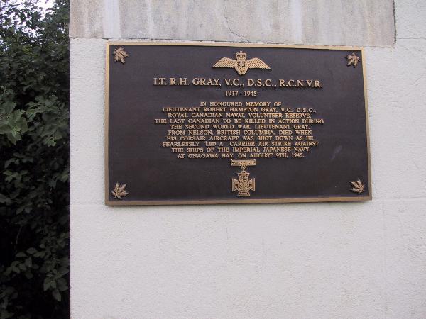 À la glorieuse mémoire du lieutenant Robert Hampton Gray, VC, DSC, de la Réserve des Volontaires de la Marine royale canadienne, le dernier Canadien mort au combat pendant la Seconde Guerre mondiale. Le lieutenant Gray, de Nelson (C.-B.), a été tué pendant un raid aérien contre la Marine impériale japonaise dans la baie d’Onagawa, le 9 août 1945. La formation de Corsair qu’il menait courageusement avait décollé un peu plus tôt d’un porte-avions allié.