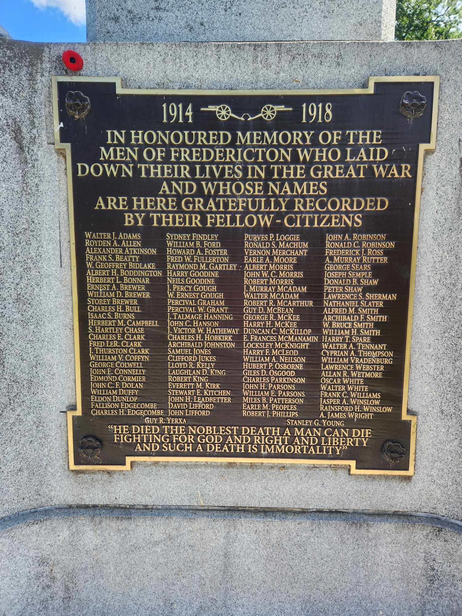 Presque tout de suite après la fin de la Première Guerre mondiale, un groupe de citoyens animés d’un fervent esprit civique a décidé d'ériger un mémorial durable, sous une forme ou sous une autre, afin de rappeler le souvenir des membres de la communauté ayant sacrifié leur vie pour la patrie au cours du conflit. Un comité baptisé le « Fredericton War Memorial Committee » a été constitué sous la présidence de M. le Juge O. Crocket de la Cour suprême du Canada, ancien député fédéral de York-Sunbury, afin d’étudier la question et de mettre l’idée en œuvre. Un haut socle de pierre posé sur une base convenable et installé sur un terrain agréablement aménagé a été jugé approprié et le triangle formé par l’intersection des rues Church, King et Queen a été choisi. Ce terrain, propriété de l’évêché, a été cédé au comité par le très révérend John H. Richardson, évêque de Fredericton, au nom de l’évêché, pour servir à l’érection du mémorial. Les plans soumis par une firme québécoise ont été choisis et les fonds nécessaires ont été amassés par souscription publique. Le terrain a été arpenté par M. Andrew MacVey, ingénieur en chef du ministère provincial des Travaux publics, auquel le comité avait demandé avis et conseils sur l’emplacement et l’érection du mémorial. Comme les plans et devis ne permettaient pas au comité de se faire une idée réaliste du mémorial, M. MacVey a fabriqué une maquette en carton afin d’aider les membres du comité, qui ne s’entendaient pas sur la direction vers laquelle le mémorial devait faire face (vers l’amont, vers l’aval, vers la cathédrale ou ailleurs), à se représenter l’apparence du mémorial dans chaque direction. M. MacVey a également prévu la disposition du texte. L’érection du cénotaphe en pierre du Québec a ensuite pu aller de l’avant, au coût d’environ 20 000 $, soit une somme considérable pour l’époque. Le monument a été inauguré le 11 novembre 1923 à l’occasion d’une cérémonie au cours de laquelle les habitants de Fredericton ont rendu un hommage bien mérité à leurs concitoyens qui avaient fait l’ultime sacrifice. Les noms des 109 « hommes de Fredericton qui ont donné leur vie pendant la Grande Guerre et dont les noms ont été inscrits ici par leurs concitoyens reconnaissants » ont été lus à haute voix pendant la cérémonie. Par la suite, le cénotaphe a été éclairé et des plaques de bronze y ont été ajoutées pour honorer la mémoire des combattants morts pendant la Seconde Guerre mondiale et la guerre de Corée. Ce magnifique mémorial fait honneur aux citoyens des jours passés qui se sont fait un devoir solennel de perpétuer la mémoire, les gestes et les sacrifices des défunts. Avec sa dignité classique et son environnement agréable, le site est empreint d’une émotion poignante, qui est perceptible en tout temps, mais qui nous étreint presque physiquement, telle une baïonnette acérée, pendant les cérémonies du jour du Souvenir, lorsque les notes obsédantes de la sonnerie aux morts, l’ultime appel de la trompette et les coups de canon se réverbèrent sur l’autre rive de la rivière et vont mourir au loin parmi les ormes, dans un silence qui semble soudain plus profond que jamais.« Au crépuscule comme à l’aube, nous nous souviendrons d’eux. » Pendant un instant, on ressent une résolution commune, un tressaillement de la chair, une ineffable solitude au moment où ces paroles évocatrices rappellent une foule de souvenirs à l’assemblée recueillie. Les premières années après la Première Guerre mondiale, les cérémonies du jour de l’Armistice (rebaptisé plus tard « jour du Souvenir ») à Fredericton étaient organisées par le chapitre sir Howard Douglas de l’Ordre impérial des filles de l’Empire (IODE). Cependant, depuis 1928, c’est la filiale de Fredericton de la Légion royale canadienne qui a toujours pris les arrangements nécessaires. Les porte-étendards des divers chapitres de l’IODE ont toutefois continué d’assister en groupe à ces cérémonies. Le comité chargé de l’érection du mémorial militaire de Fredericton se composait des membres suivants : l’honorable juge Crocket, président; la comtesse d’Ashburnham; le lcol T.G. Loggie; Mgr l’évêque Richardson; Son Honneur le maire J.A. Reid; le lcol C.J. Mersereau; M. George H. Clarke, conseiller municipal; l’honorable juge Barry; M. R. FitzRandolph; M. R.B. Hanson, c.r., député; M. G.N.C. Hawkins; M. C.C. Jones, L.L.D., chancelier de l’Université du Nouveau-Brunswick; Mme N. Dougherty; M. C.A. MacVey; M. J. Stewart Neill; M. J.A. Cain, conseiller municipal; M. F.L. Cooper, conseiller municipal; M. Harry A. Smith, conseiller municipal; M. J.J.F. Winslow, c.r.; M. W.D. Gunter; M. John T. Jennings; E. Allison MacKay, secrétaire. Une plaque à la mémoire des membres de la Marine marchande a été ajoutée récemment. {A History of the Fredericton Legion}
