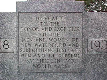 Ce mémorial est dédié aux hommes et aux femmes de New Waterford et des districts avoisinants qui ont combattu pendant les Première et Seconde Guerres mondiales et la guerre de Corée.
