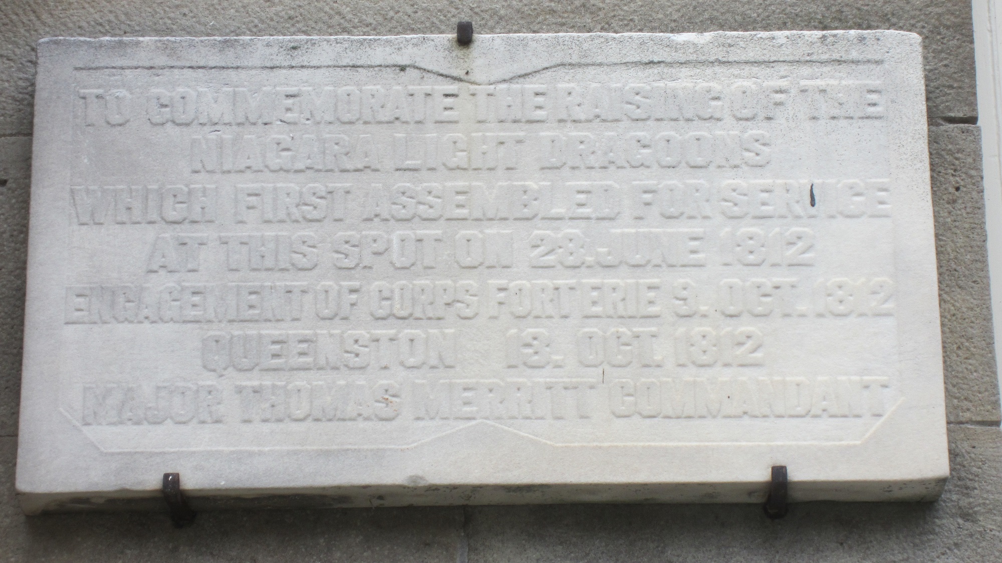 Cette tablette commémore la levée de la troupe Niagara Light Dragoons, dont les membres se sont rassemblés pour la première fois à cet endroit le 28 juin 1812. Elle a été érigée par la société d’histoire de Niagara au début des années 1900.