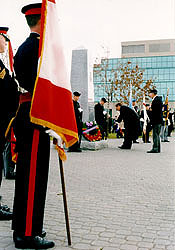 La cérémonie d’aujourd’hui marque la fin d’un projet entrepris à la fin des années 90 par la filiale de Bells Corners de la Légion royale canadienne, par une lettre à l’ancien maire de Nepean, M. Ben Franklin. Le maire Franklin et son conseil ont offert un appui considérable au projet, tout comme les membres de son personnel. Le comité de planification a tenu sa première réunion en février 1991. Il se composait de Bill Levesque, directeur de la planification et du développement au service des parcs et des loisirs, et du colonel John Gardam, C.M.M., C.D., ancien commissaire aux scépultures de guerre du Canada et du Commonwealth et actuellement gérant de projet pour le monument commémoratif pour la paix qui doit être dévoilé l’an prochain, sous la direction de Clair Adams, de la Légion royale canadienne.