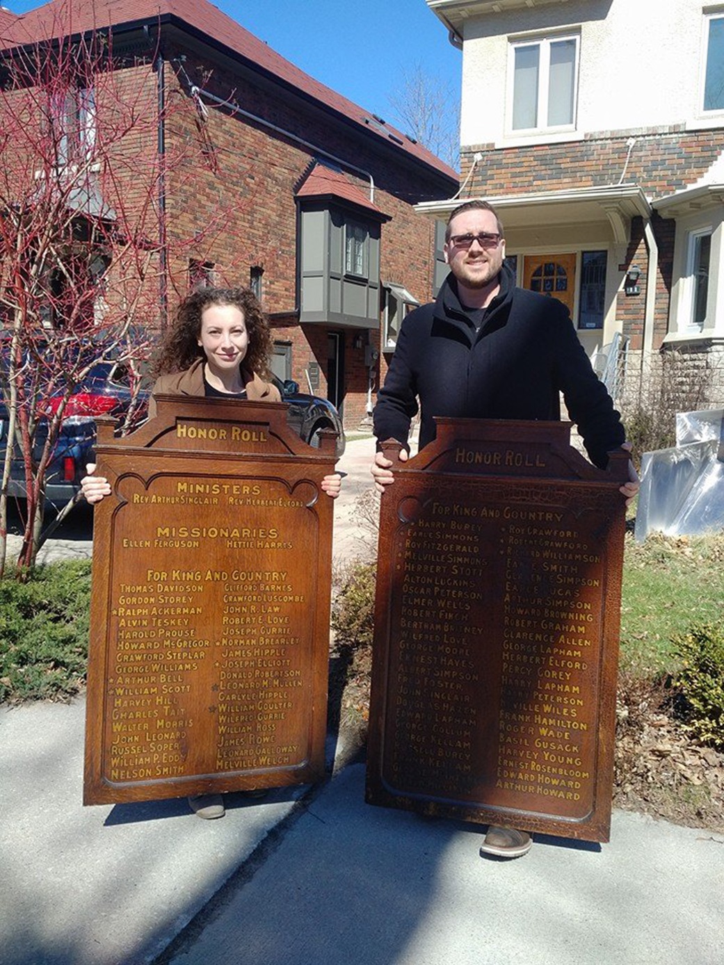 Le lendemain, elle a fait des recherches sur certains des noms figurant sur les panneaux, ce qui l’a conduite au site Web de la Sarnia Historical Society. Roz a communiqué avec le président de la société, Ron Reale Smith, qui a pensé que les panneaux, qui étaient des tableaux d’honneur de la Première Guerre mondiale indiquant les noms des hommes de la région qui ont servi ou sont morts au cours du conflit, pouvaient provenir d’une église ou d’un club militaire de Sarnia. Elle a rapidement remis les panneaux à la Sarnia Historical Society et Ron les a ramenés à Sarnia. Randy Evans, un historien local, a ensuite tenté de déterminer comment un objet rendant hommage à des dizaines de vétérans de Sarnia avait pu se retrouver sur un tas d’ordures à Toronto.