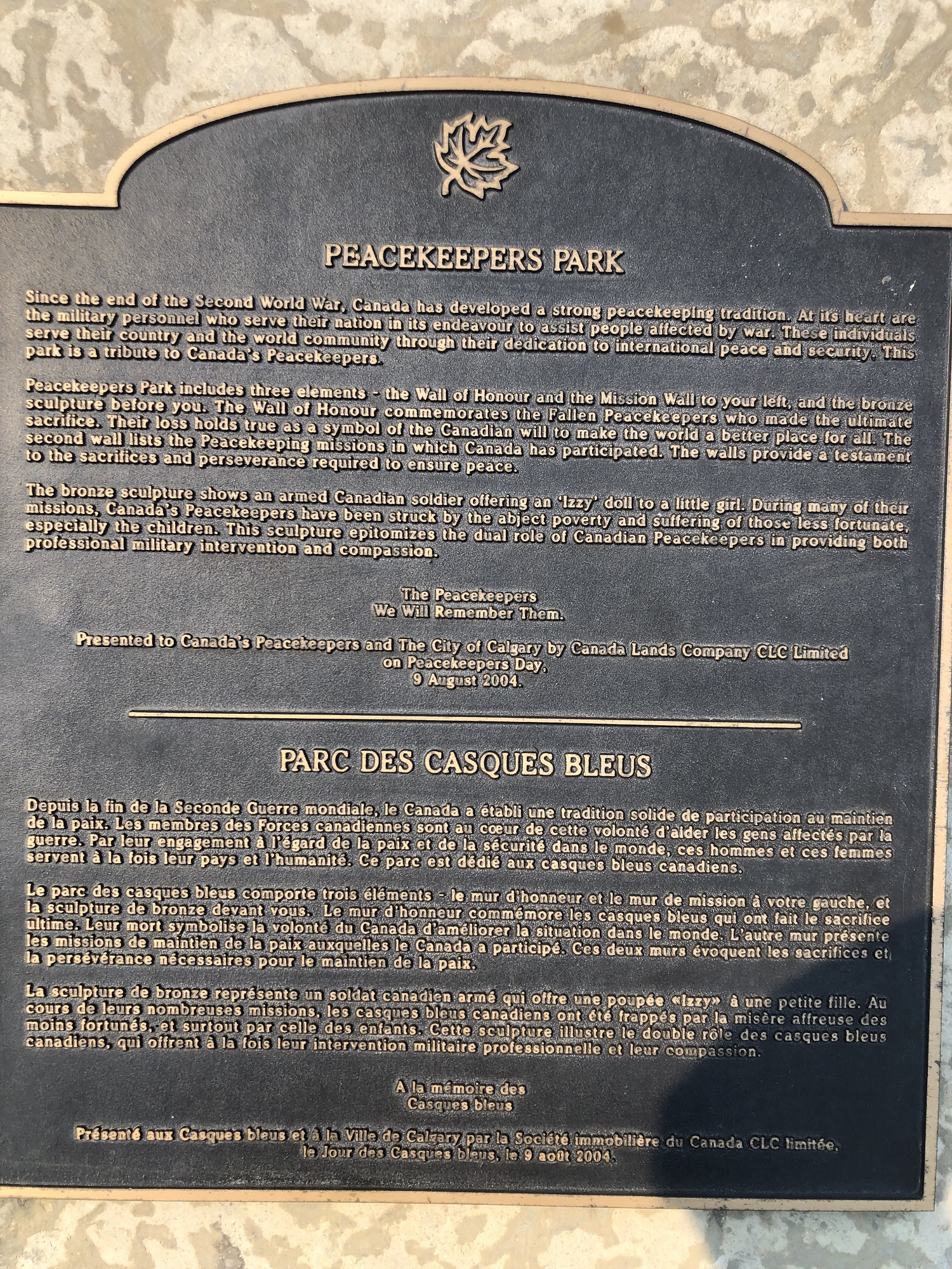 Le parc Peacekeepers comprend la « Peacekeeper Statue » symbolisant les Casques bleus canadiens, le Mur d’honneur qui rend hommage à ceux qui ont perdu leur vie au nom de la paix, ainsi que le Mur des missions. Le parc a été complété en 2004. La section de Calgary de l’Association Canadienne de Vétérans des Forces de la Paix des Nations Unies a fourni des conseils et des suggestions pour la conception du parc et de la statue.