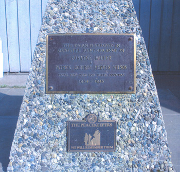 Ce monument commémoratif est dédié à deux hommes qui sont morts pendant la Seconde Guerre mondiale. Le 1er Régiment du génie l’a élevé le 11 novembre 1986. La face ouest du monument porte une plaque de bronze mesurant 12 po de hauteur sur 18 po de largeur. Le cairn a 77 po de hauteur et la base au sol mesure 9 po de hauteur tout comme la deuxième base. Le monument a été restauré récemment.