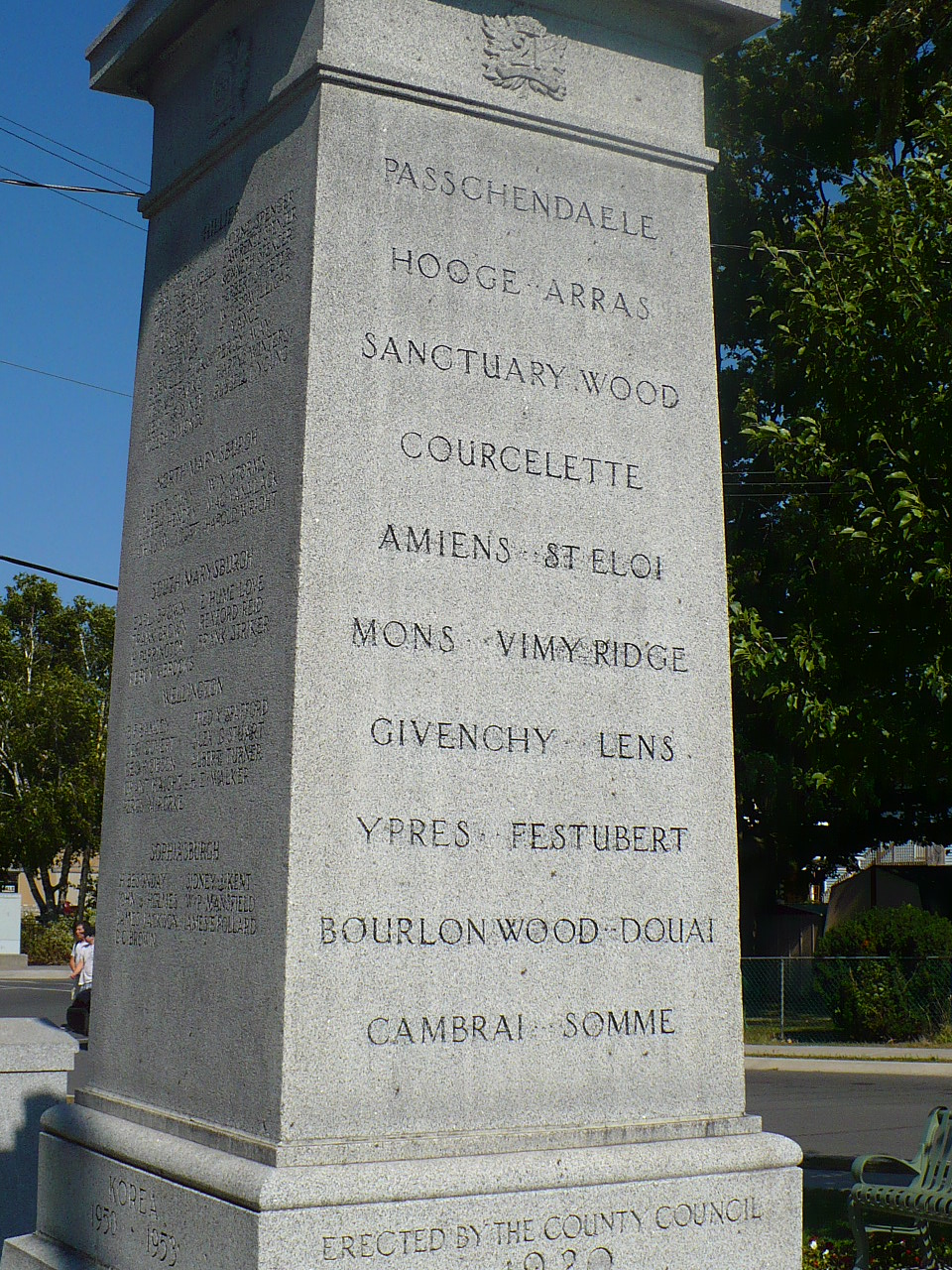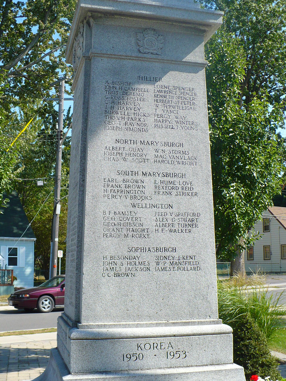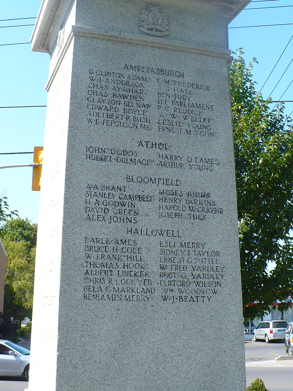 En mai 1920, un comité du mémorial a été constitué, composé notamment de représentants de la Great War Veterans Association, de la Prince Edward County Old Boys Association et de la Prince Edward County Agricultural Society. Ce comité devait faire une recommandation au conseil du comté. Enfin, après le rejet d’un projet de construction d’une salle commémorative, l’érection d’un monument a été décidée.