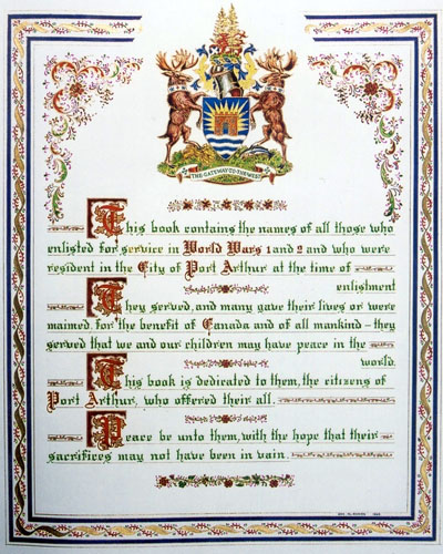 Le comité du conseil municipal chargé des relations de guerre, et composé notamment du Dr Hutchinson, de George Wardrope, d’Arthur Evans et du président Tommy McCullogh, a invité Mme Dorothy Hughes, avec l’aide de beaucoup d’autres, à recueillir et à classer les noms, et Mme Ava Evans, réputée pour ses talents en la matière, à réaliser la calligraphie.
