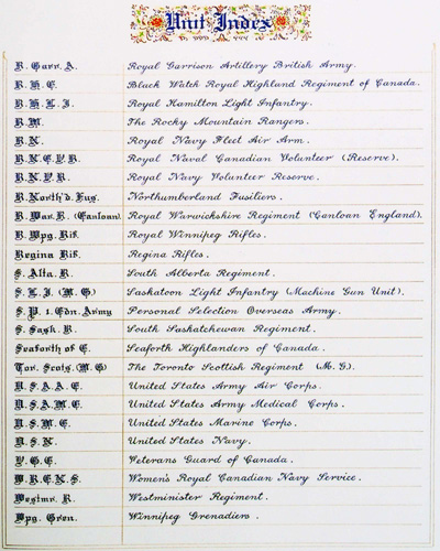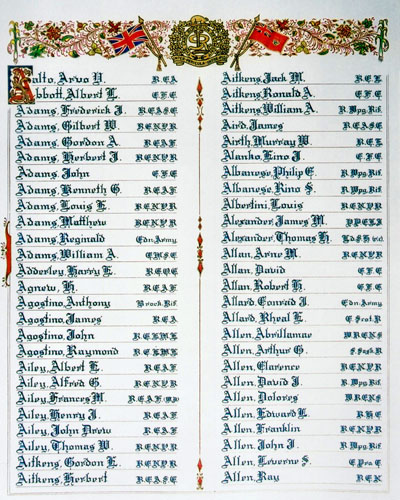 À partir de 1942-1943, les noms ont été recueillis à divers endroits comme le magasin Eaton, le bureau de poste et les pharmacies de la localité. Cette tâche avait été confiée aux nombreuses Dames auxiliaires actives pendant les années 1940. Certains noms peuvent cependant avoir été omis de la liste puisqu’il incombait aux parents, aux amis et aux anciens militaires de les fournir. Le livre contient les noms de 2 709 personnes, dont : – 106 ont été tuées au combat; – 24 ont été prisonniers de guerre; – 20 ont disparu; – 16 ont été décorées.